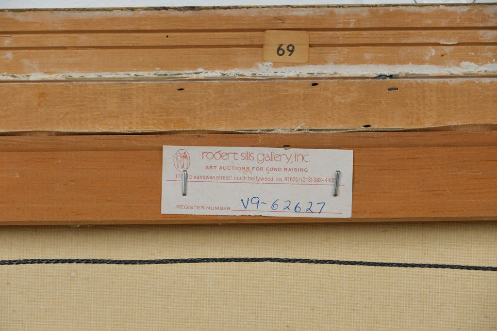 The painting is presented in an ornate gold-accented frame with black inner trim, complementing the bold blues and earthy tones of the artwork. A gallery label from Robert Sills Gallery, Inc. (North Hollywood, CA) remains on the back, attesting to its provenance from a reputable fundraising art auction.
