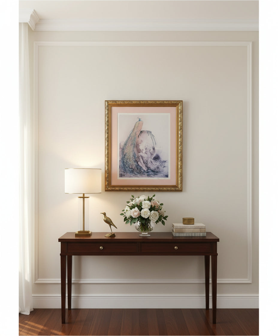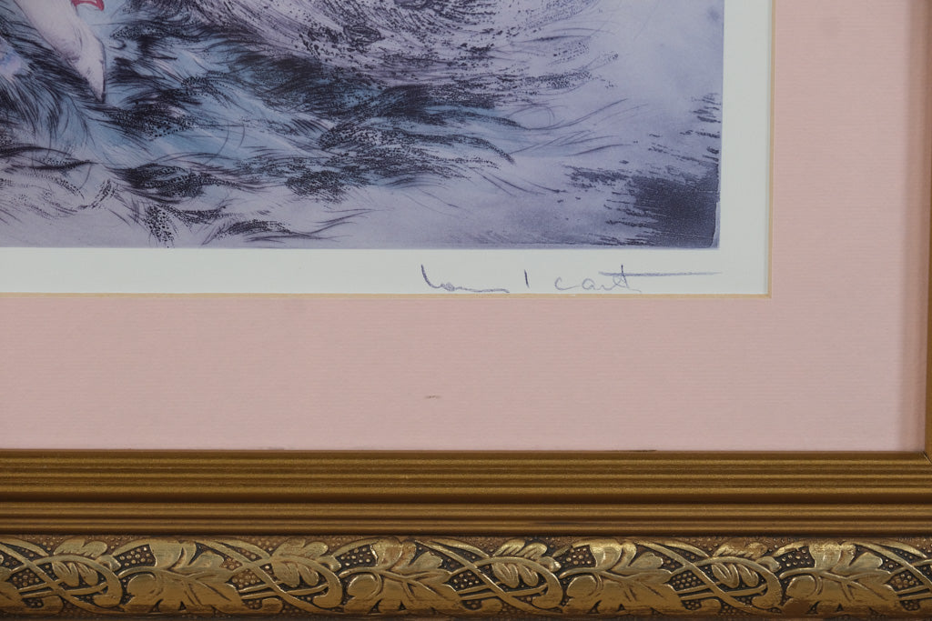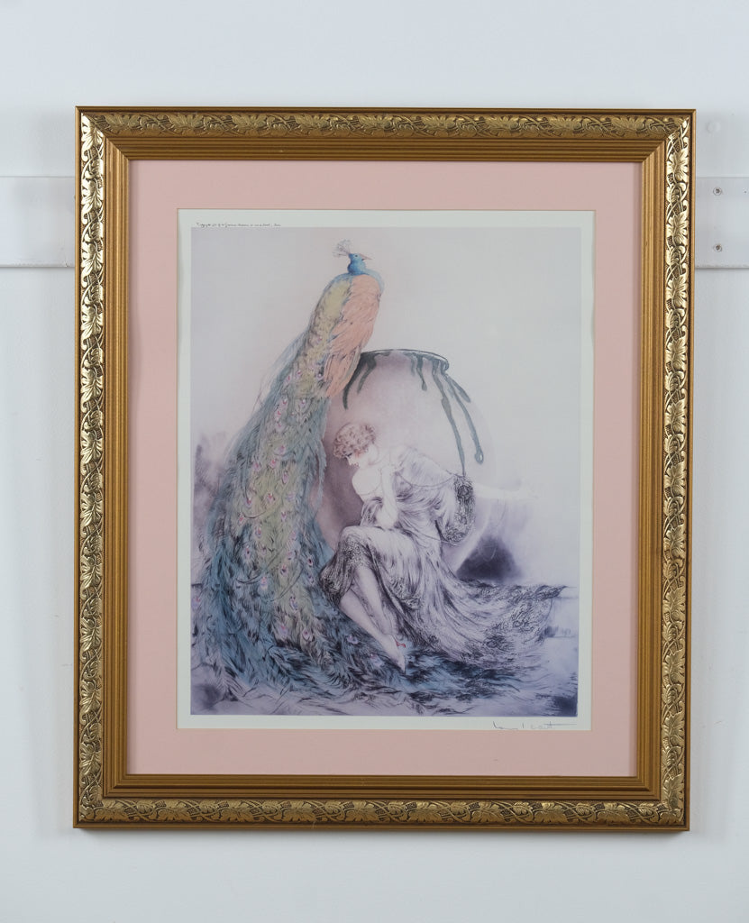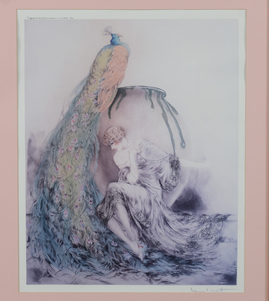 Radiating grace and sophistication, this exquisite “Woman with Peacock” print by Louis Icart captures the romantic elegance that defined the Art Deco era. A poised woman in a flowing gown sits beside a resplendent peacock, the bird’s iridescent feathers cascading in soft blues and greens that shimmer with delicate detail. Icart’s signature fluid style and refined palette convey both beauty and quiet opulence.
