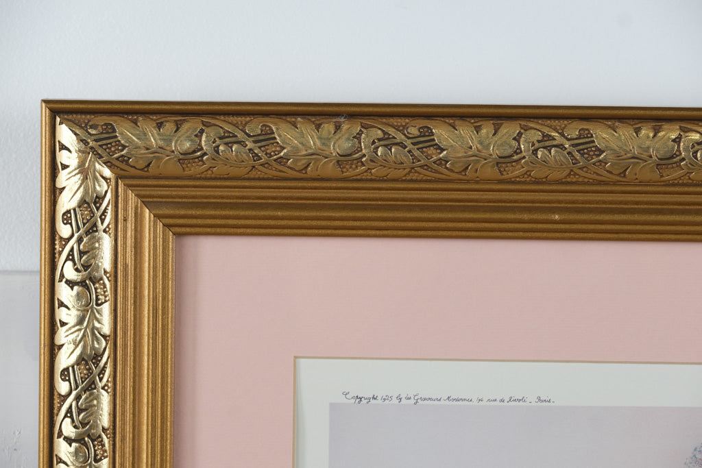 This piece is a 1925 copyright edition published by Les Graveurs Modernes, 194 Rue de Rivoli, Paris — a hallmark of authenticity and period craftsmanship. The artwork is professionally framed in a gold-accented frame with a complementary blush pink mat, enhancing the pastel tones of the composition. A timeless centerpiece for any refined collection or romantic interior.