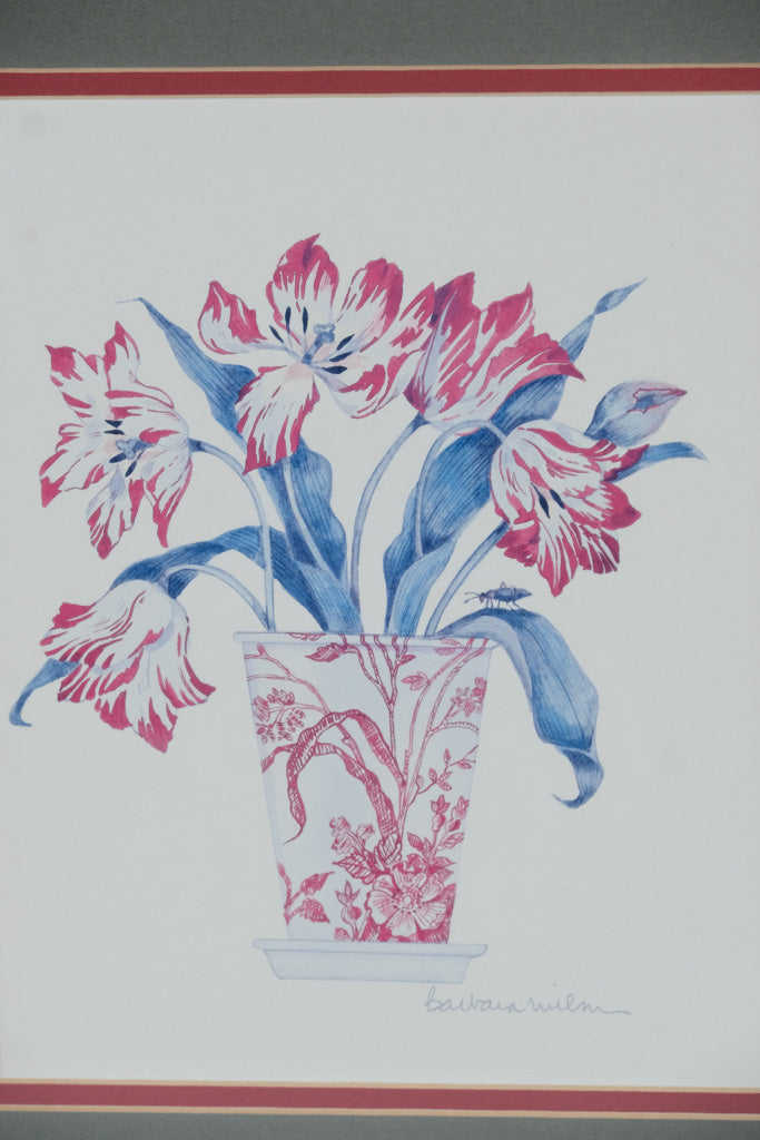 Add a refined pop of color to your space with “Tulip IV”, a beautifully framed floral print by artist Barbara Wilson. Featuring painterly red and blue tulips arranged in an ornate vase, this piece blends modern elegance with classic botanical charm. The artwork is professionally matted in gray and red double mats and set in a brushed silver wood frame with a subtly distressed finish. Perfect for bedrooms, entryways, or living spaces, this art print complements both traditional and contemporary interiors.