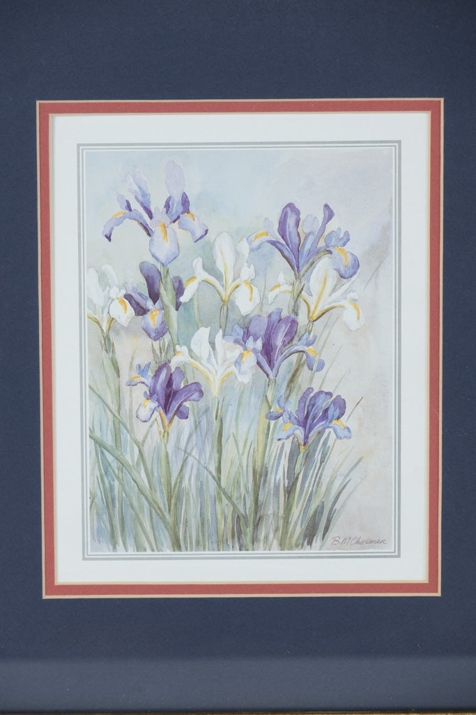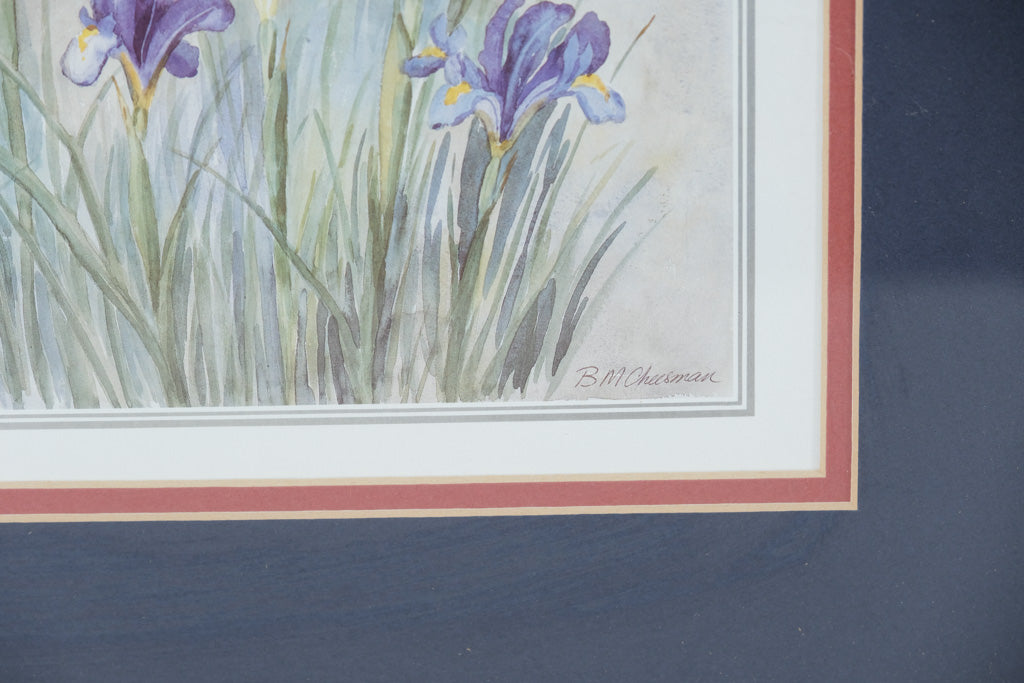 Bring soft botanical beauty to your home with this set of two framed floral prints by artist B.M. Cheesman. Titled “Irises” and “Salvia”, these delicate watercolor-style pieces capture the tranquil grace of garden blooms in shades of purple, lavender, and soft green. Each artwork is professionally framed in a muted gold-tone wood frame with navy blue and rose double mats, creating a cohesive and elegant pairing. Perfect for traditional, cottage, or transitional interiors.