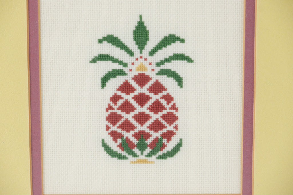 Bring handmade charm and color to your home with this set of four framed cross-stitch artworks, each featuring a timeless folk-art motif. The collection includes a pineapple (symbol of welcome), a floral basket, a fruit tree, and a bird on a branch, each rendered in fine cross-stitch detail on cream fabric. Each design is individually framed and matted in coordinating pastel tones β yellow, sage, green, and blue β for a cohesive yet varied display. Perfect for cottage, farmhouse, or traditional interiors, these pieces can be hung together as a set or displayed separately.