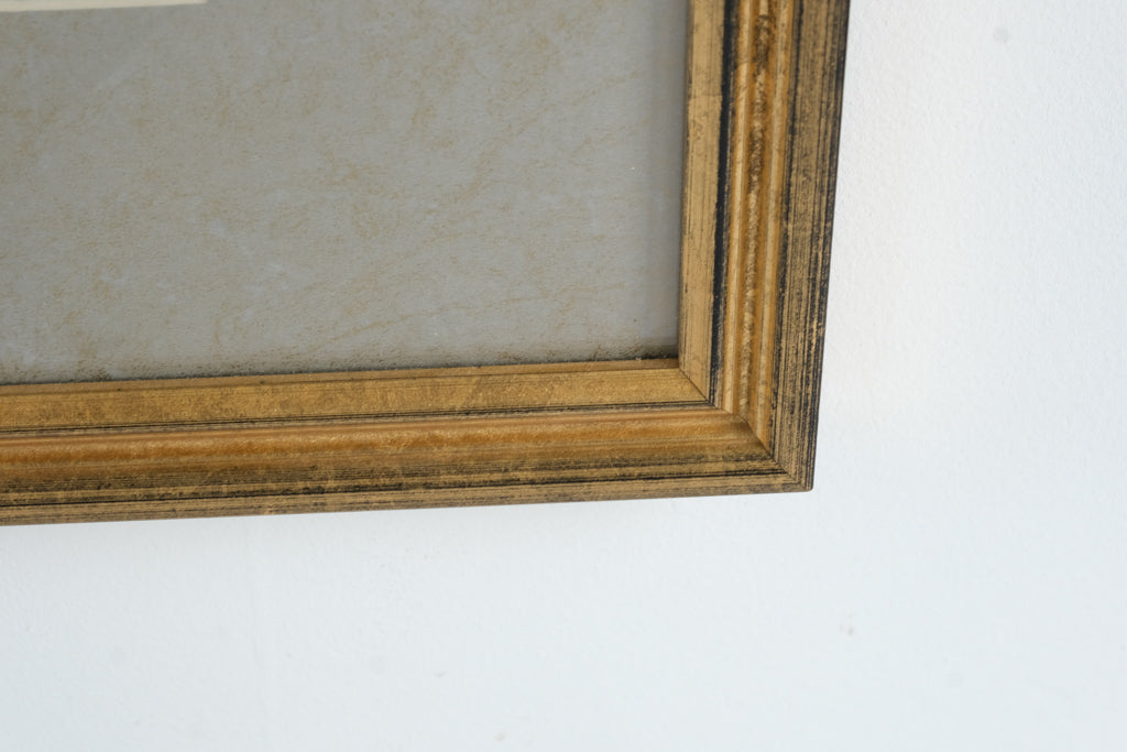 Frame: Dark wood and black composite frame with double matting (navy and ivory inner borders)