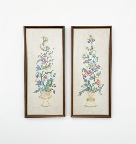 Pair of Vintage Crewel Embroidery Wall Art – Floral & Bird Motif Framed Textiles, 11"x25"