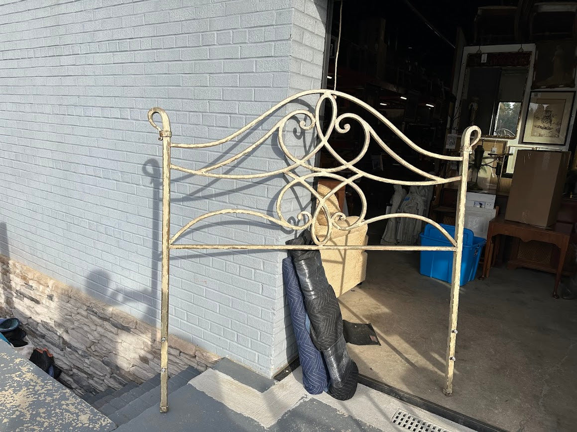 Gracefully sculpted and beautifully timeworn, this vintage wrought iron queen bed showcases an elegant swirl motif that brings a romantic, European-inspired charm to any bedroom. Its hand-forged curves and substantial weight evoke enduring craftsmanship and refined artistry.