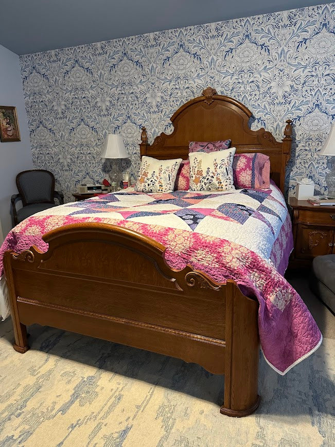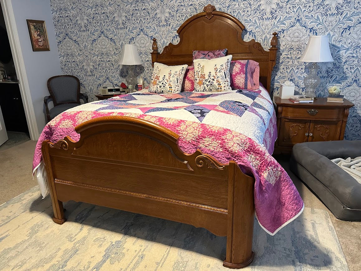 The softly arched headboard and carved detailing create a focal point that elevates any bedroom. Its warm oak finish pairs effortlessly with traditional bedding, layered quilts, and antique-inspired décor, yet remains versatile enough for transitional styling.