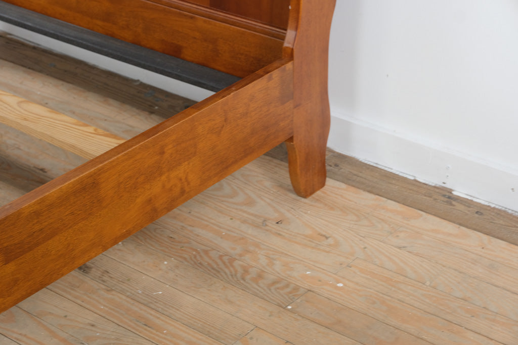 With its graceful silhouette and warm wood tones, this queen-size sleigh bed embodies timeless sophistication and enduring craftsmanship. Its gently curved headboard and footboard create an elegant, sculptural presence that adds a touch of classic refinement to any bedroom setting.
