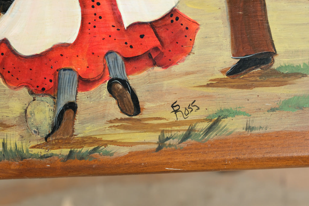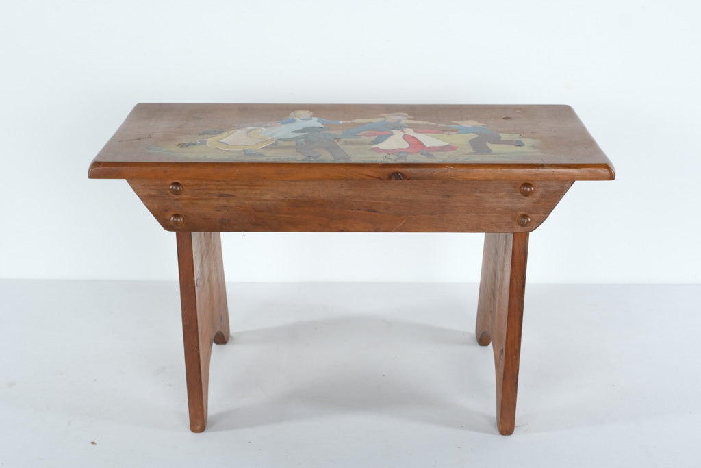 This charming wooden bench features a hand-painted folk art scene depicting children holding hands in a joyful circle dance, rendered in warm, traditional colors with expressive detail. The painting is signed “Ross” and sits atop a nearly flawless wood surface, making the artwork the clear focal point of the piece.