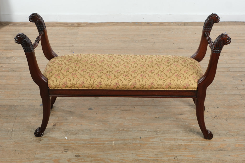 Carved wood upholstered bench by Henredon Furniture, designed in a traditional neoclassical style with sculpted lion head arms and saber legs. Solid wood frame supports a 54 inch seat with shaped crest rails and turned stretcher detail between the arms. Offered by Craze Furniture, this high quality accent bench reflects Henredon craftsmanship with refined carving, balanced proportions, and tailored upholstery suited for entry, bedroom, or formal living spaces.