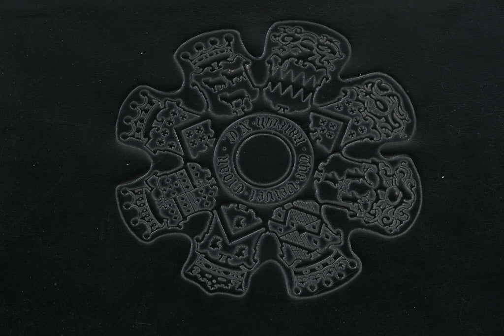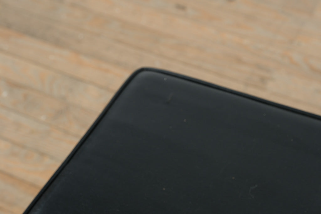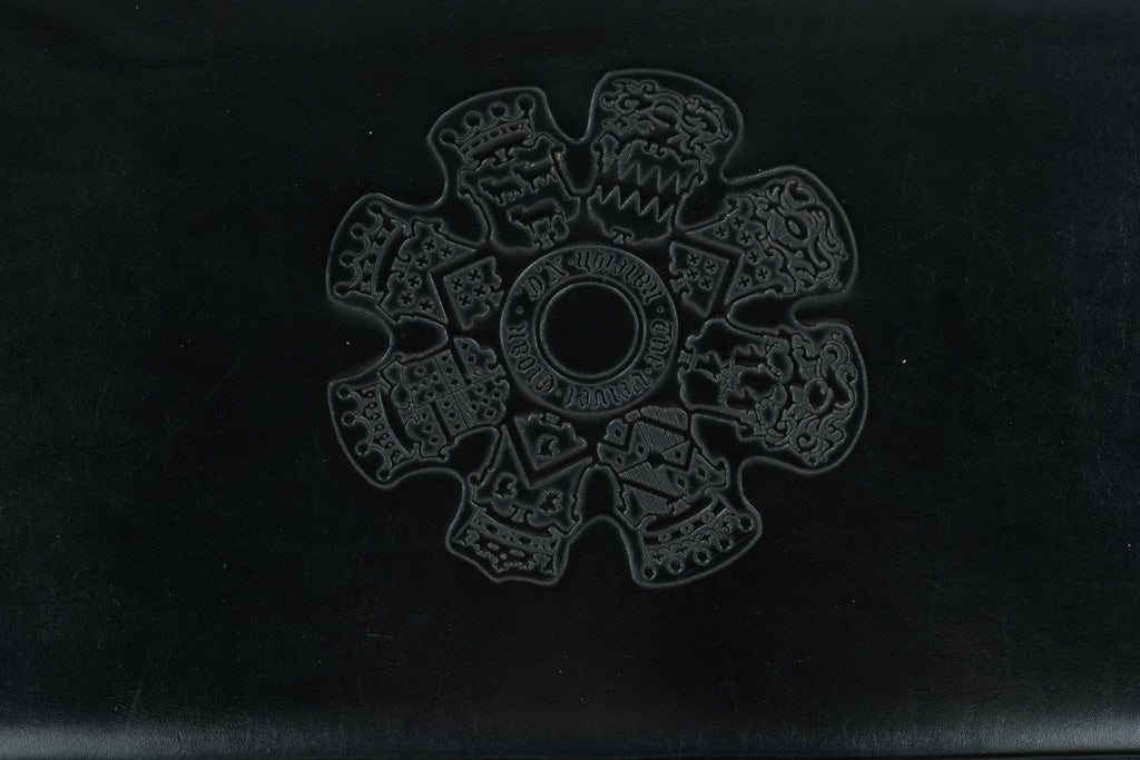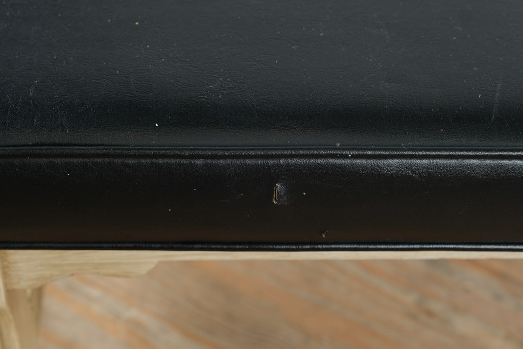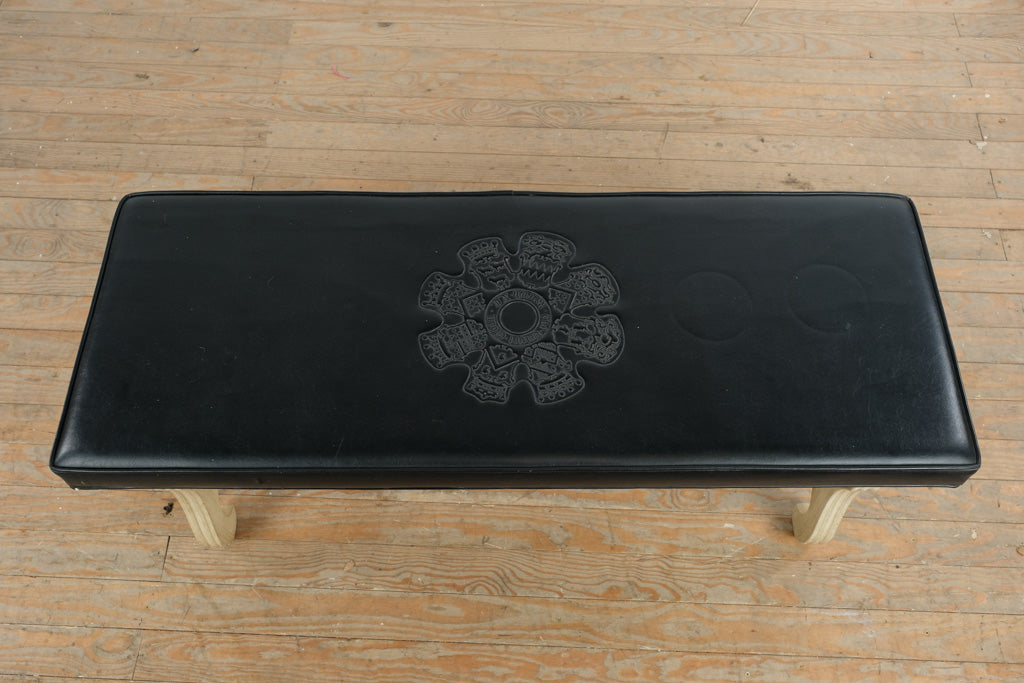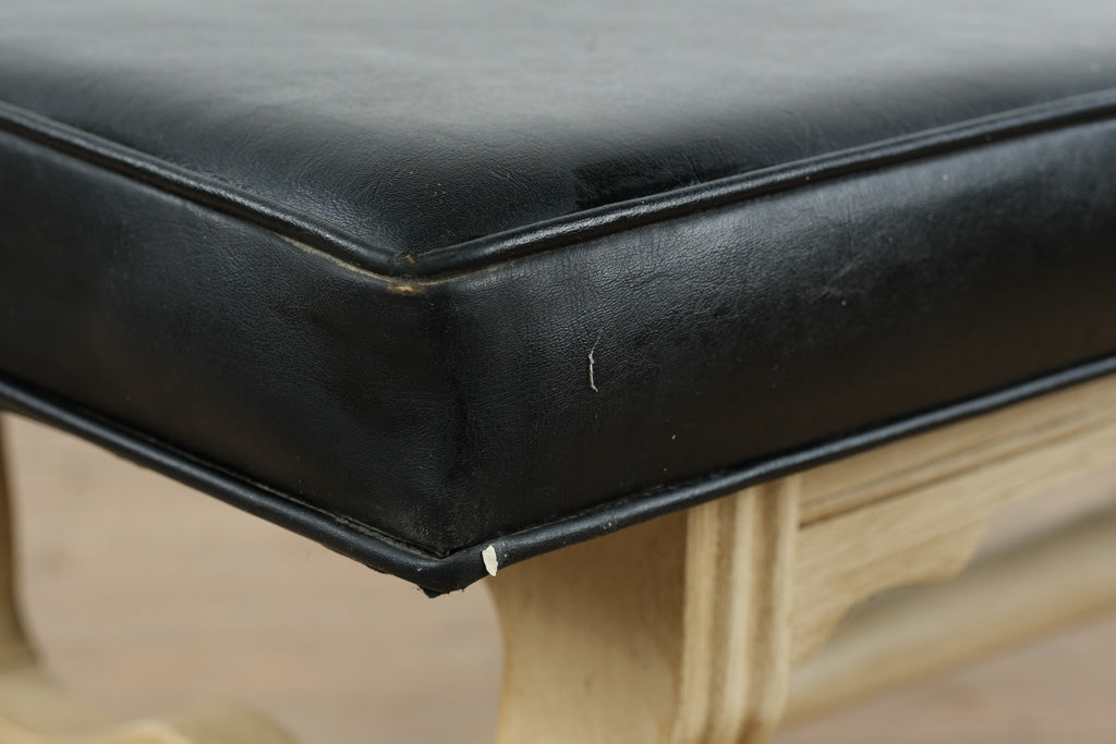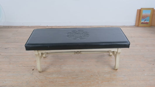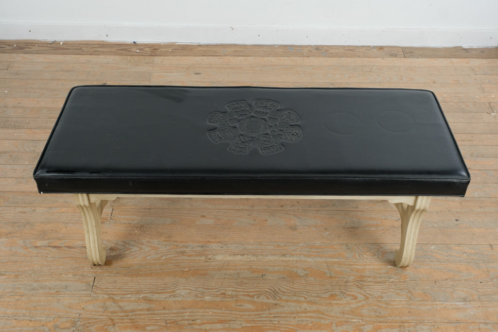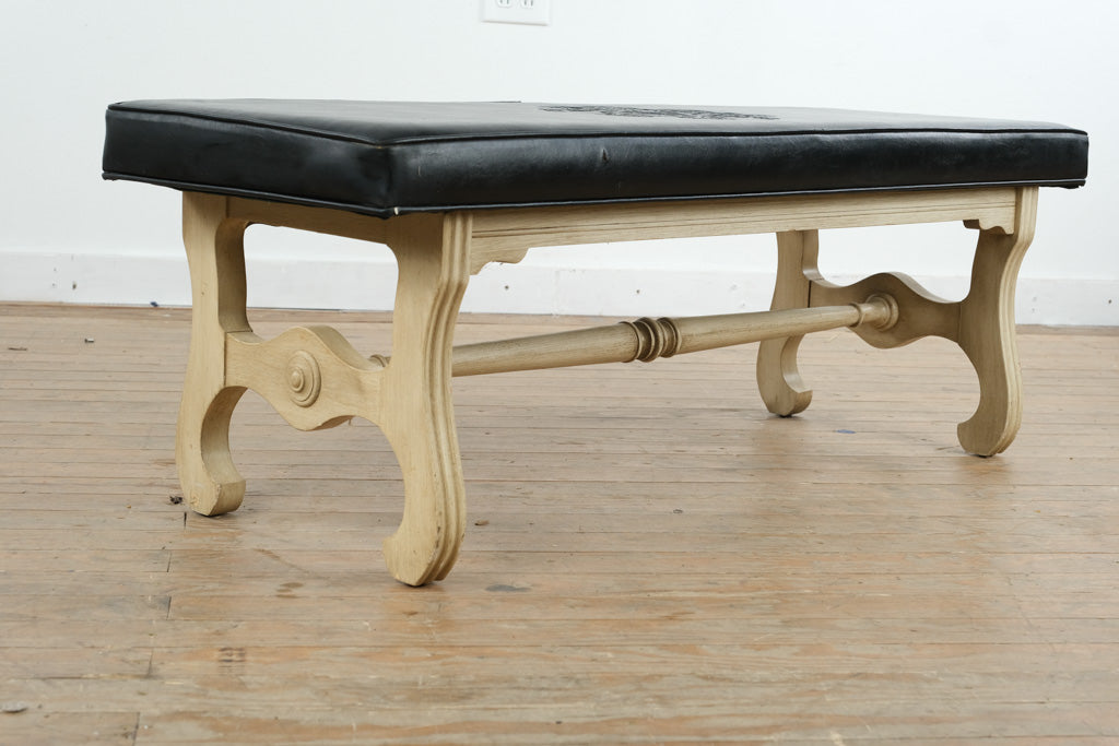 Black vinyl upholstered bench with painted wood base and traditional carved stretcher, featuring an embossed Velvet Cloak Raleigh NC hotel crest. The pressed heraldic motif references a historic Raleigh hospitality interior, giving the piece clear regional provenance and repeatable design appeal. Craze Furniture offers multiple examples, each consistent in form with minor variations from use.