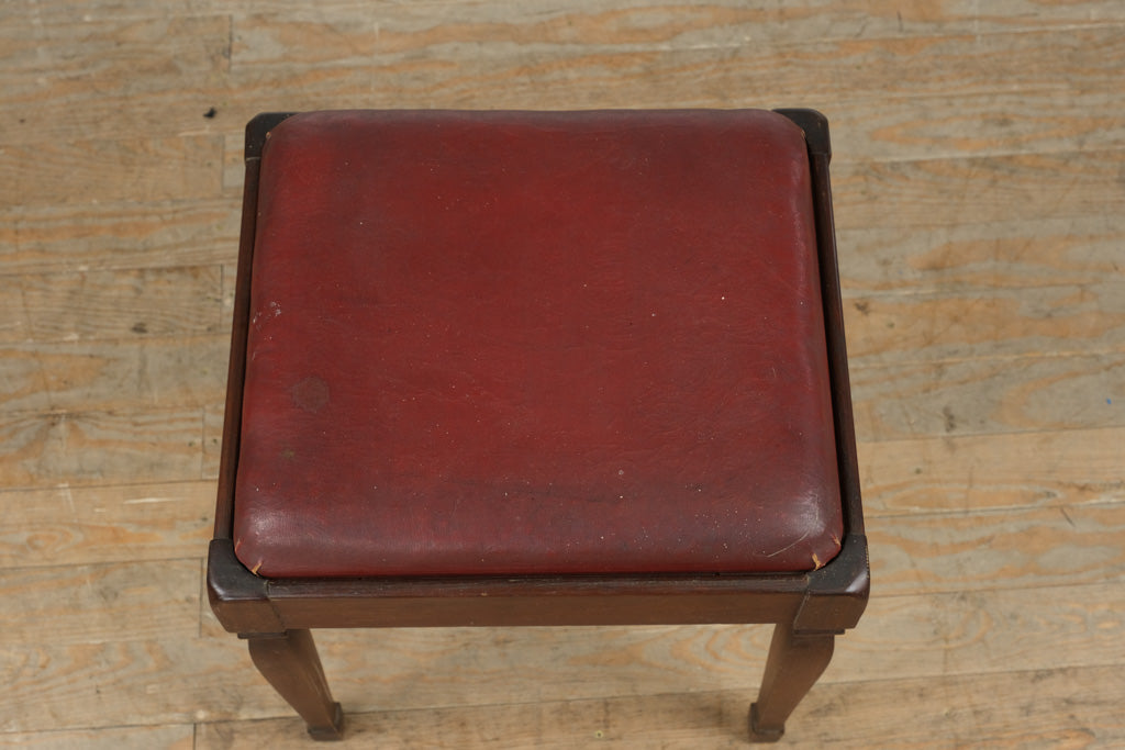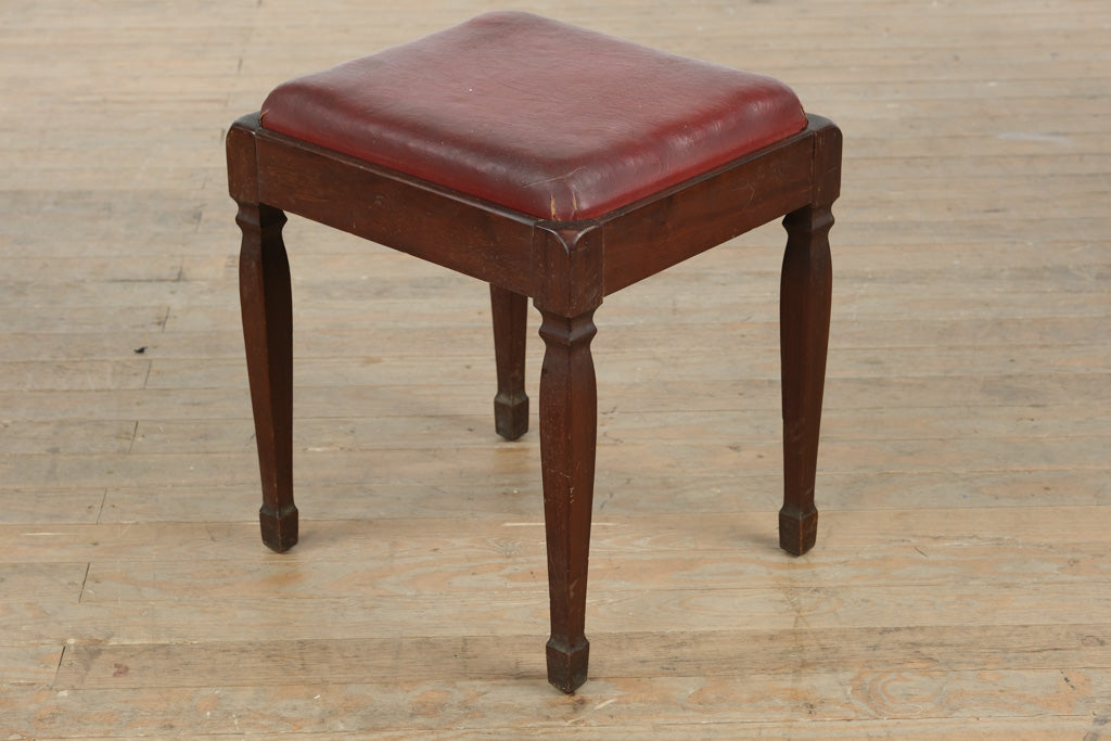 Charming vintage wood vanity bench featuring a deep red vinyl upholstered seat and classic tapered legs. Compact, sturdy, and full of character, this piece works well as a makeup vanity stool, piano bench, accent seat, or small entryway perch.