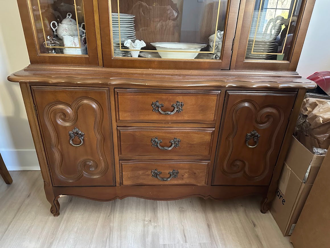 Graceful and timeless, this Bassett French Provincial china cabinet brings classic European elegance to the dining room with its warm walnut finish, curvilinear silhouette, and refined carved details. The upper glass-front hutch beautifully displays china or collectibles, while the thoughtfully designed lower case offers generous concealed storage, making this a statement piece that balances beauty and practicality.