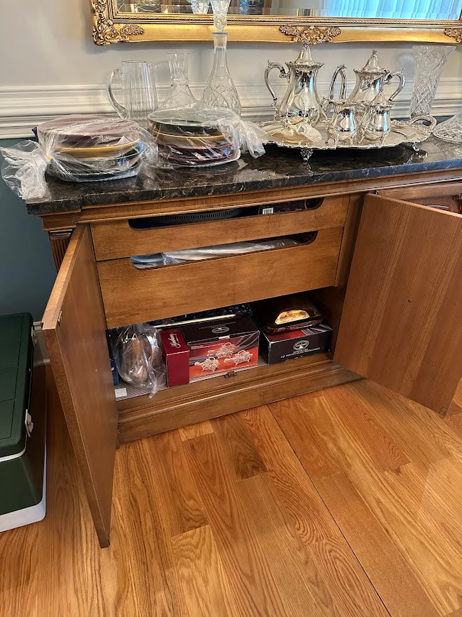 A substantial marble top Davani buffet that pairs European inspired design with enduring solid wood craftsmanship.
