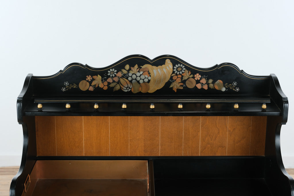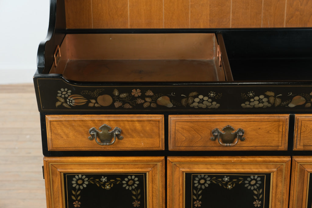 Produced by Ethan Allen, likely within their American Traditional or Heirloom-inspired offerings, this dry sink features a black painted case accented by warm wood tones and detailed gilt stenciling. Decorative fruit and floral motifs, scalloped cresting, and classic brass hardware reflect the timeless Hitchcock aesthetic. The interior includes a removable copper tray, designed originally for wash use and easily adaptable for modern applications.