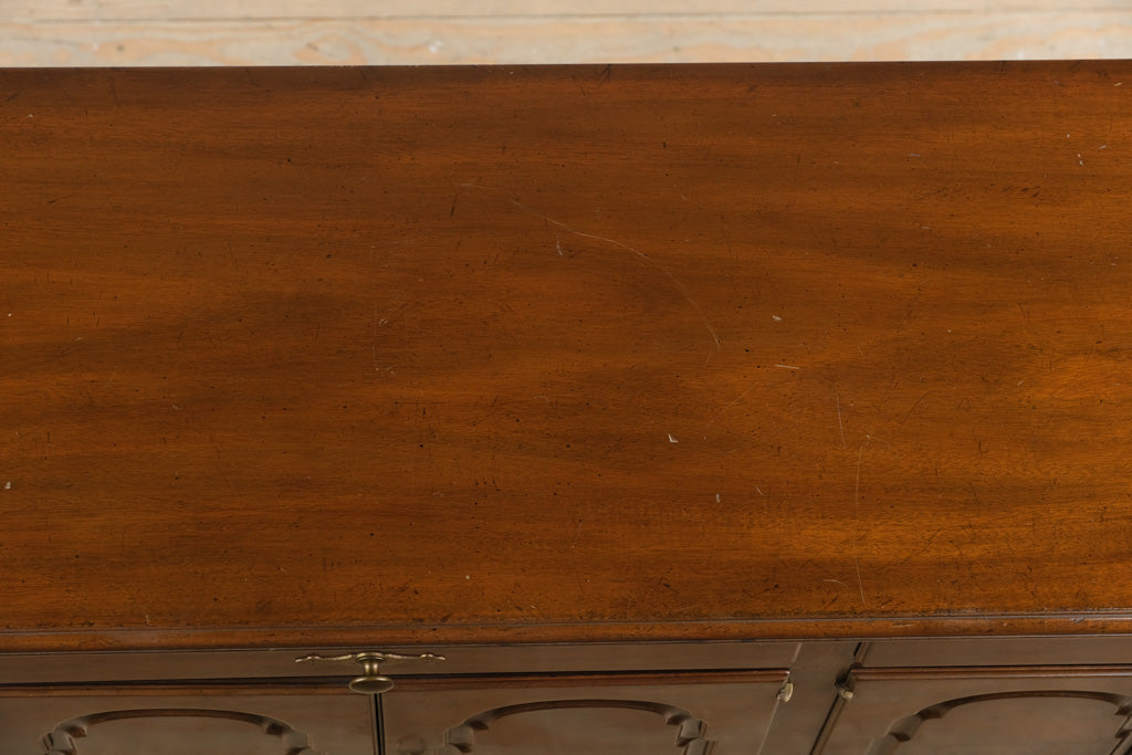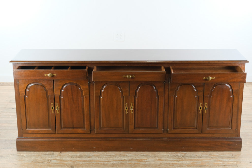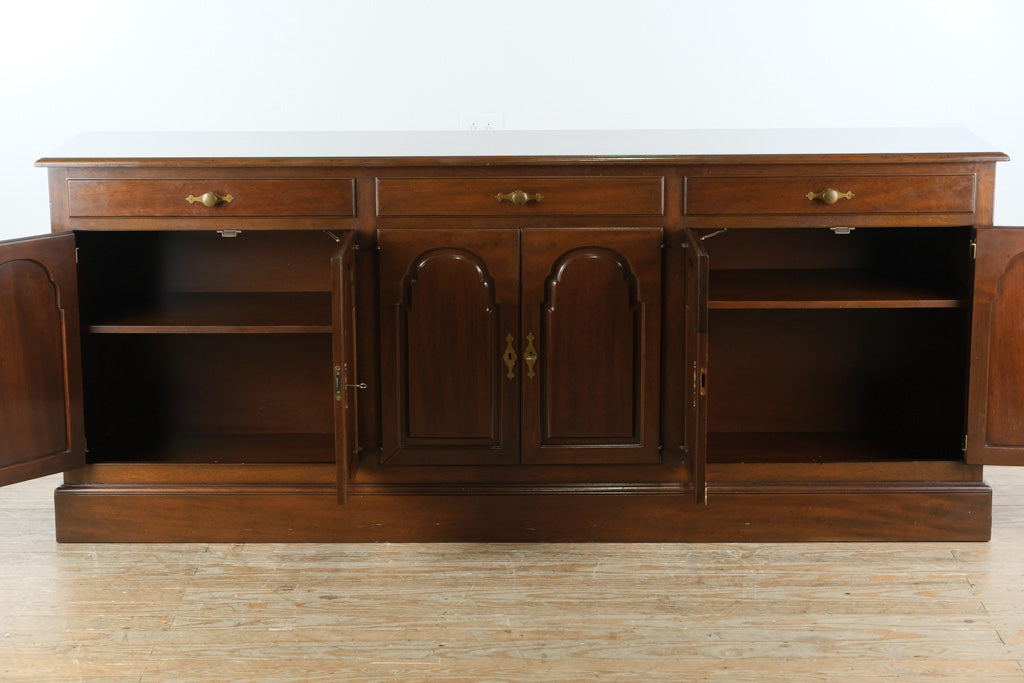 Crafted from solid mahogany, this buffet reflects Kittinger’s renowned commitment to quality construction and classic design. The case features raised panel doors with graceful arch detailing, three smoothly operating drawers above, and finely finished surfaces throughout. The warm mahogany tone highlights the natural grain, while understated brass hardware completes the look with period-appropriate elegance.