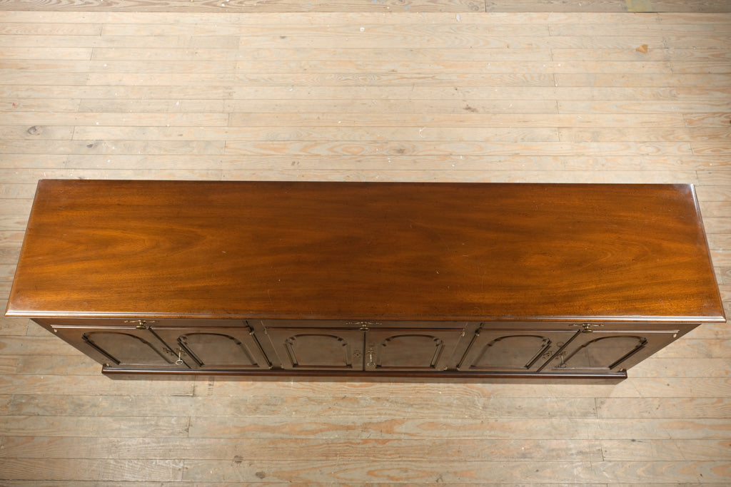 A refined example of American traditional craftsmanship, this solid mahogany buffet by Kittinger showcases timeless proportions, exceptional materials, and the quiet confidence of heirloom-quality furniture. With its long, low profile and beautifully balanced façade, this piece offers both visual presence and practical storage in equal measure.