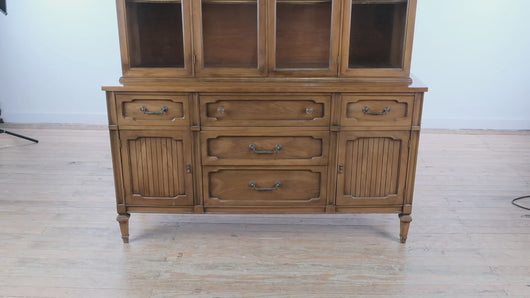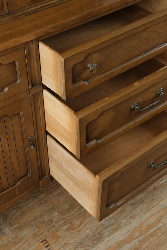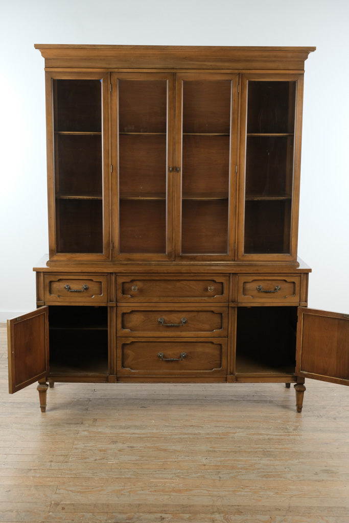 Crafted in richly grained walnut, this cabinet showcases classic mid-century craftsmanship with clean joinery, softly sculpted drawer fronts, and beautifully finished interiors. The upper section features framed glass doors and adjustable shelving for display, while the lower case combines drawers and cabinets with solid wood construction and vintage-inspired hardware.