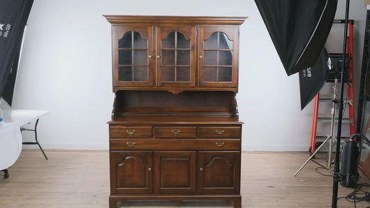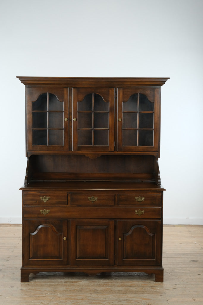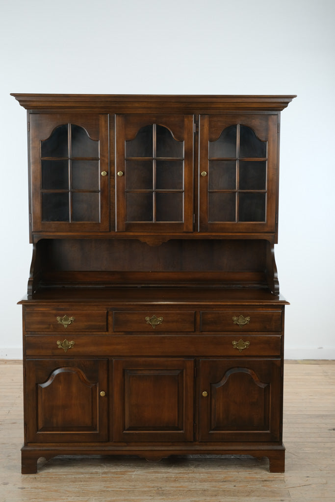 A commanding and increasingly scarce example of early American craftsmanship, this antique L. Hitchcock two-piece hutch and sideboard showcases the maker’s celebrated balance of refined utility, enduring construction, and quiet elegance. Richly finished solid wood, classic paneled forms, and a beautifully proportioned glass-front upper cabinet combine to create a centerpiece that reflects Hitchcock’s legacy of quality furniture made to last generations.