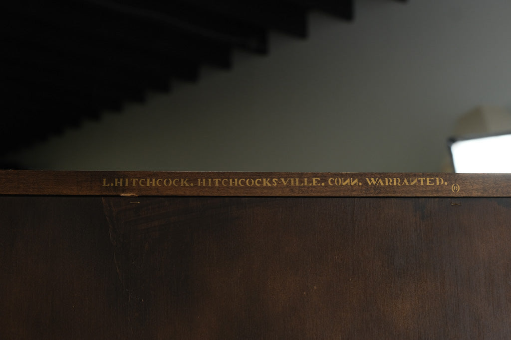 Constructed entirely of solid wood, this substantial piece exemplifies the workmanship that established L. Hitchcock as one of the most respected American furniture makers of the 19th century. Both the upper hutch and lower sideboard are clearly stamped Hitchcock, underscoring authenticity and historical integrity. The upper cabinet features divided glass doors with grooved backing designed for vertical plate display, along with additional glass shelving both above and below, offering flexible and elegant storage. Traditional brass hardware, paneled doors, and finely finished drawers complete the composition.