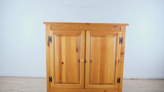 Constructed from solid pine with traditional joinery and a smooth hand-rubbed finish that highlights the natural grain and knots of the wood. The piece features paneled double doors, three spacious drawers below, and subtle carved detailing along the upper edge. Round wooden knobs and black metal hinges add a touch of timeless contrast.