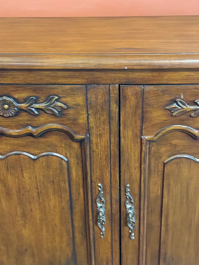 Crafted from solid wood, this cabinet showcases traditional French Provincial design elements, including shaped panel doors, floral and scroll carvings, and softly contoured edges. The warm, hand-finished wood tone highlights natural grain variations, while the substantial construction reflects quality furniture-making meant to last.