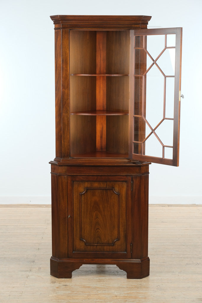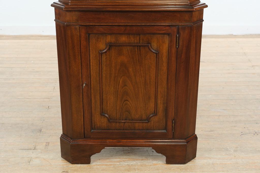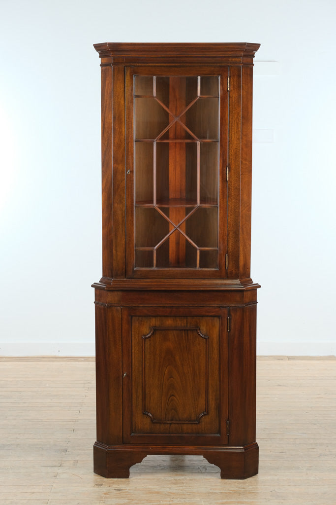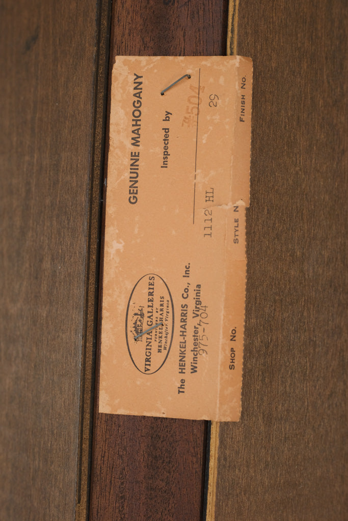 Crafted from genuine mahogany, this cabinet reflects the exceptional standards of Virginia Galleries and Henkel-Harris production. The finely shaped corner form maximizes storage while maintaining an elegant footprint, with carefully molded edges, paneled doors, and classic muntin detailing in the glass-front upper section. Style 1112 HL is especially prized for its balanced proportions and refined traditional presence.