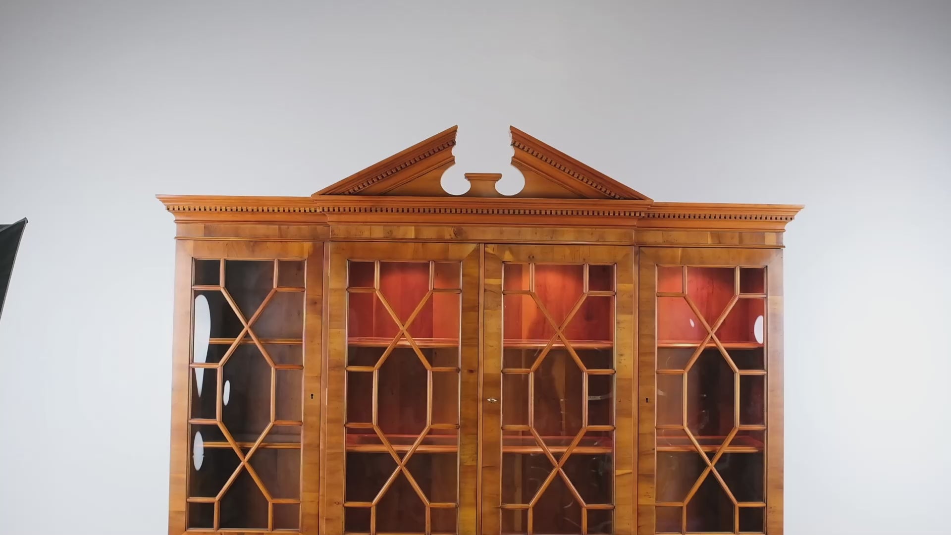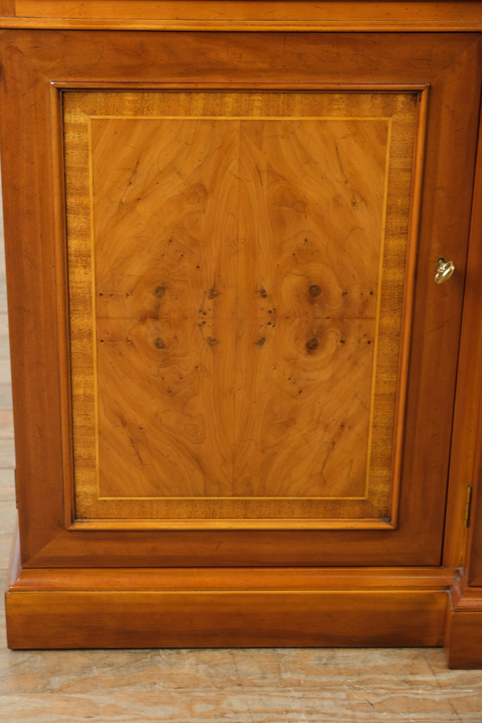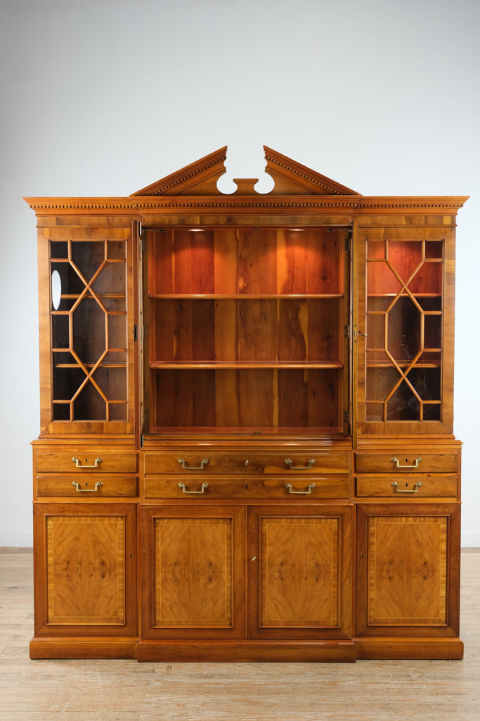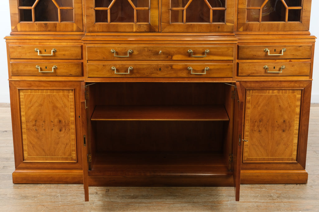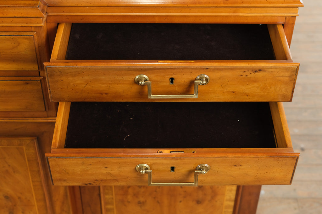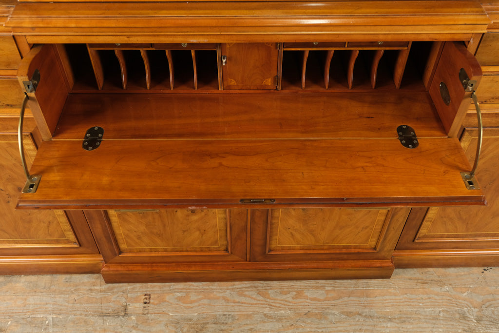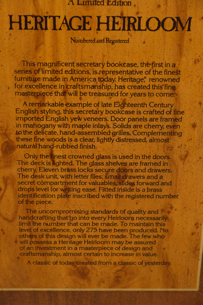 A statement piece of exceptional presence, this limited-edition Heritage Heirloom china cabinet with integrated pull-out secretary showcases the refinement of late-18th-century English styling, rendered in luminous cherry and maple with finely crafted geometric grille doors, brass hardware, and a beautifully finished solid-wood back. Its grand pediment, elegant mullions, and richly figured veneers create a visually stunning focal point with both display and storage sophistication.