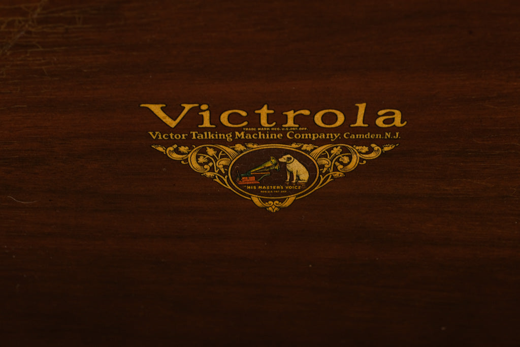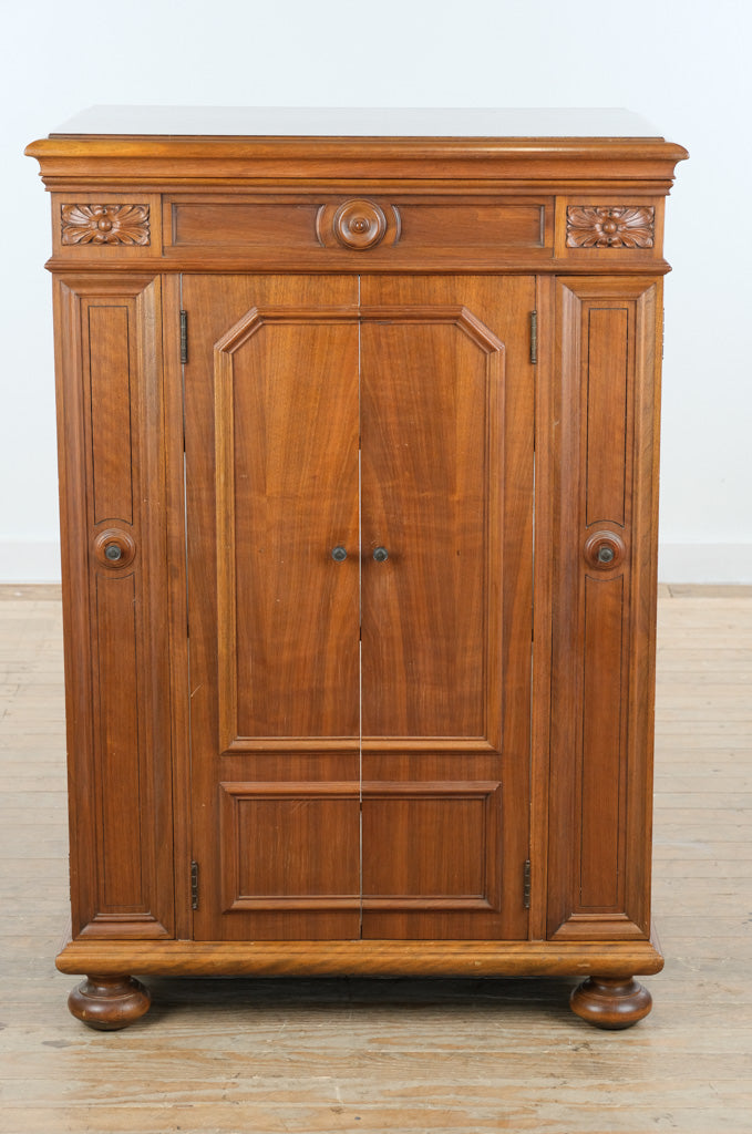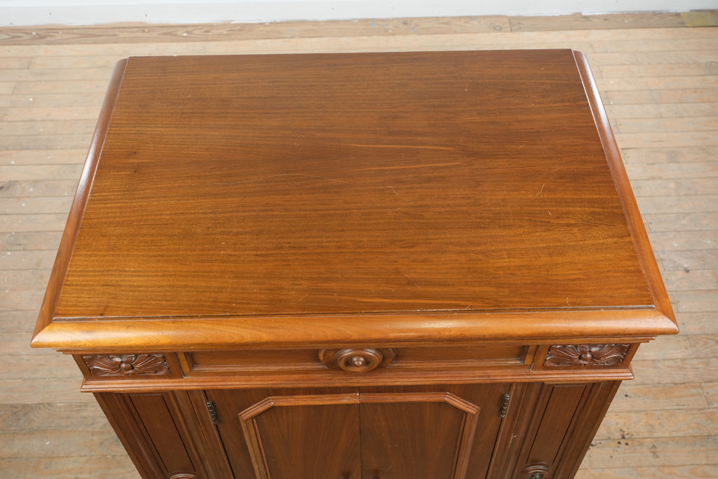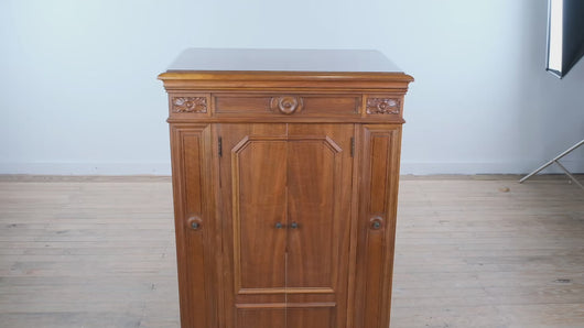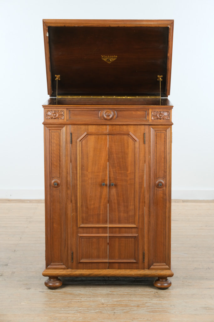 Constructed from mahogany with a warm, aged finish, this cabinet features classic proportions, paneled doors, and carved details that reflect the craftsmanship of early phonograph furniture. The hinged lift-top opens to a generous interior, originally designed to house a Victrola, while the lower cabinet provides shelved storage. Decorative carvings, turned feet, and solid construction give the piece both visual weight and enduring quality.