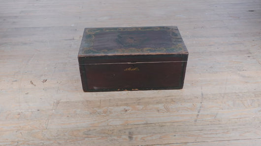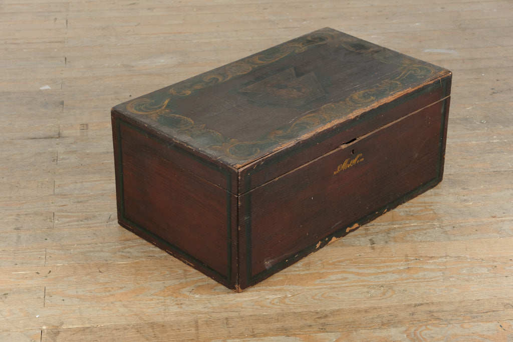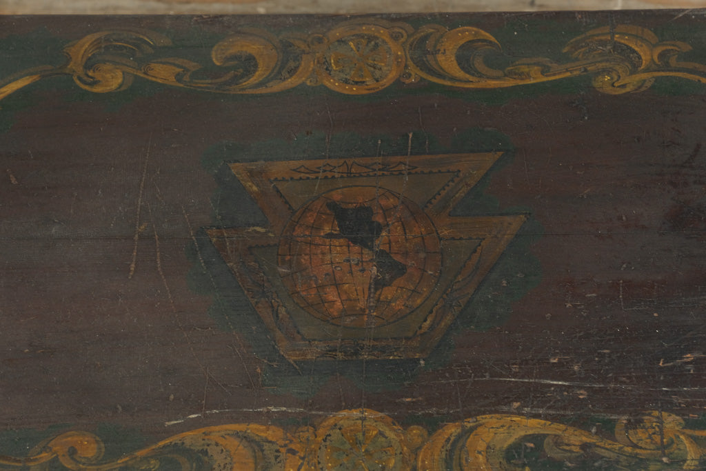 This Antique Hand-Painted Trunk beautifully captures 19th-century craftsmanship and folk artistry. With its deep patina, timeworn finish, and original decorative details, this chest tells a story of age and authenticity. The hand-painted scrollwork and shield motif across the lid are elegantly framed in dark green and gold tones, lending the piece a rich, time-softened character that speaks to its handmade heritage.