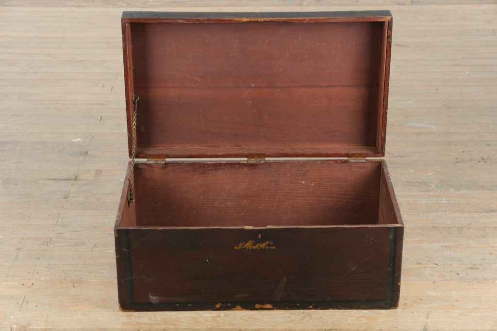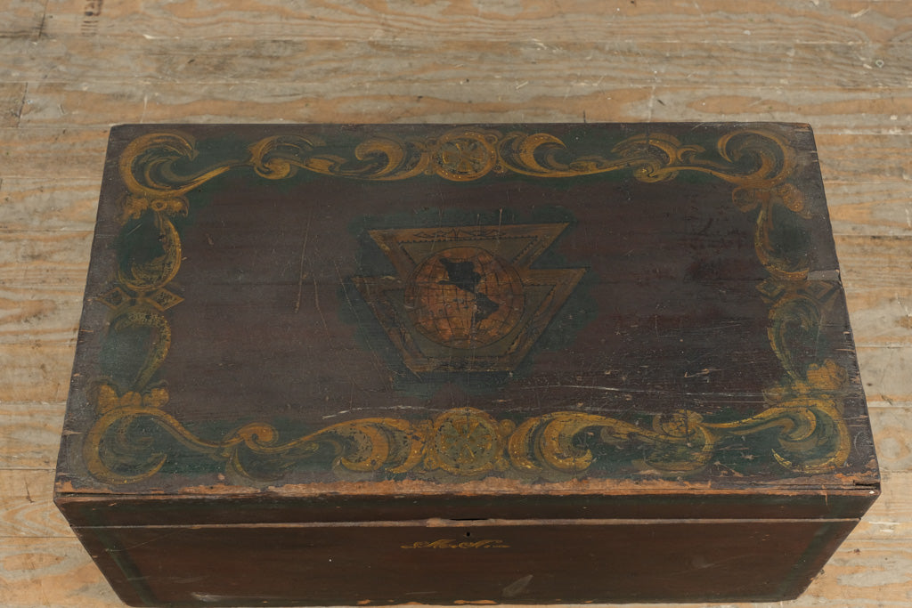 Constructed from solid wood with hand-forged hinges, this trunk features hand-painted flourishes around the borders and an aged varnish that has mellowed beautifully over time. The surface retains its original brushwork and wear, offering a warm, lived-in charm ideal for antique lovers and collectors of Americana or primitive décor.
