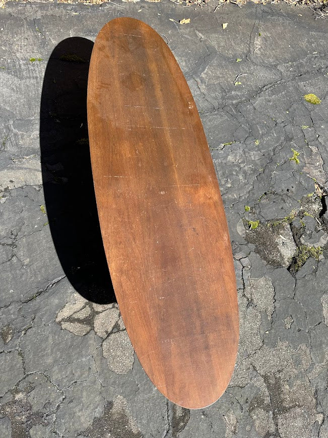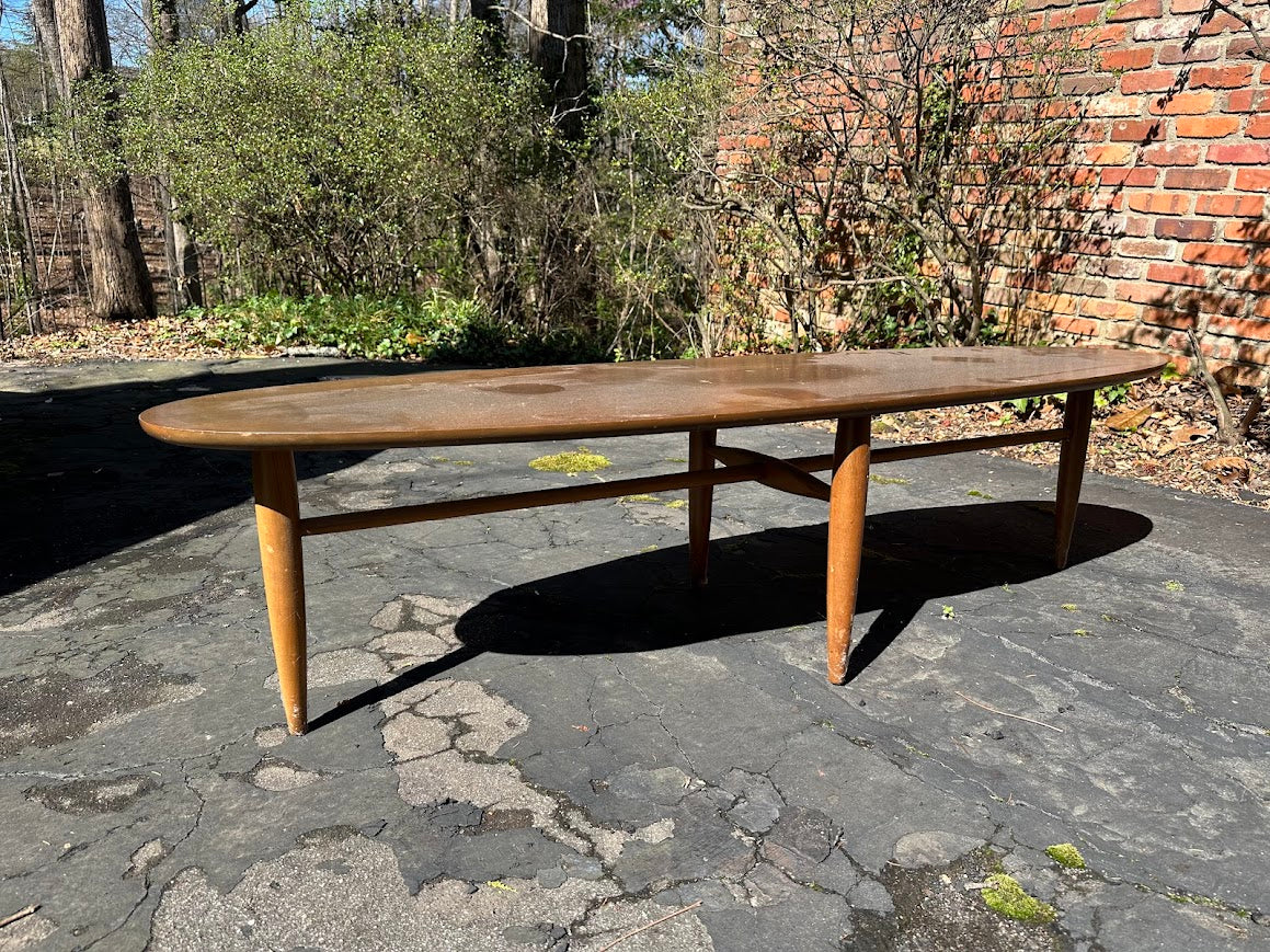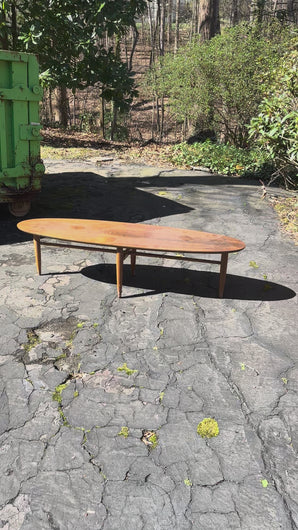 Mid Century Modern walnut coffee table by Mersman featuring an elongated oval top and sculptural tapered leg base characteristic of American modern furniture design from the 1950s and 1960s. The low, surfboard inspired profile and extended proportions reflect the era’s emphasis on organic forms and open living spaces. Offered through Craze Furniture, the piece demonstrates Mersman’s reputation for accessible modern design with practical scale and distinctive silhouette.