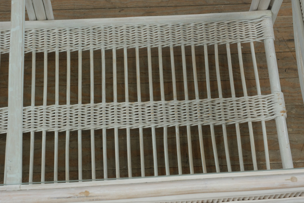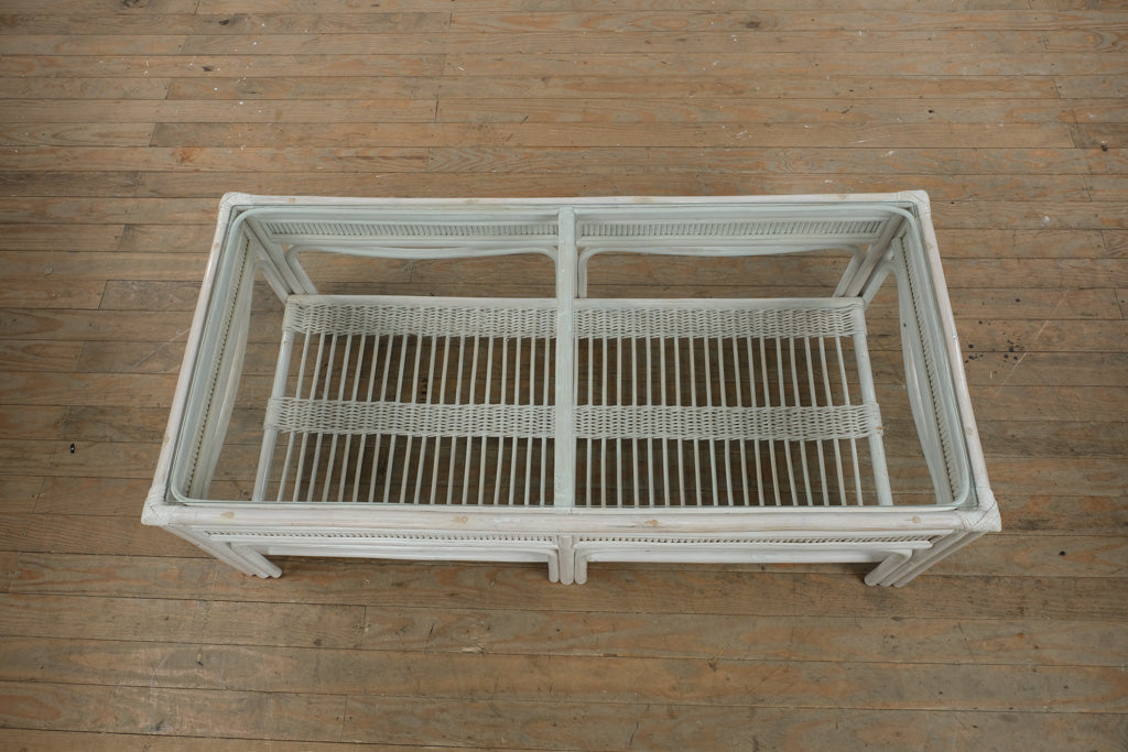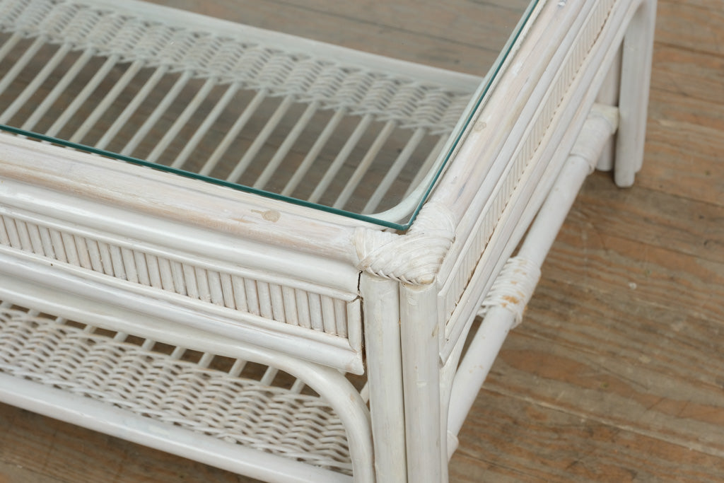 This vintage white rattan coffee table embodies effortless coastal charm with its airy frame and glass top that highlights the beauty of natural light. Its open lower shelf adds function and texture, creating a timeless centerpiece ideal for relaxed yet refined interiors.