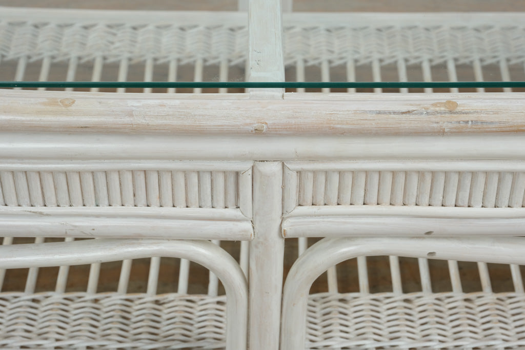 Expertly crafted from sturdy rattan with a soft whitewashed finish, this table features intricate woven details and gently curved supports. The inset glass top offers a clear, elegant surface while allowing the craftsmanship beneath to remain visible. Its handwoven lower shelf provides both durability and understated artistry.