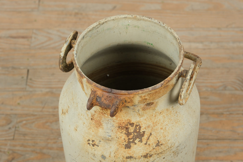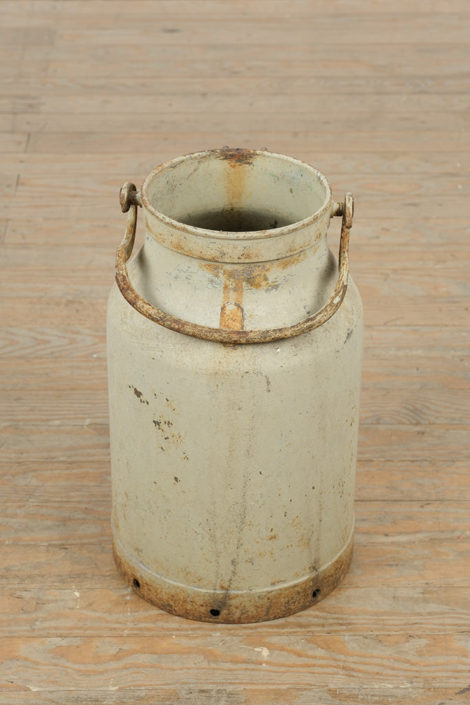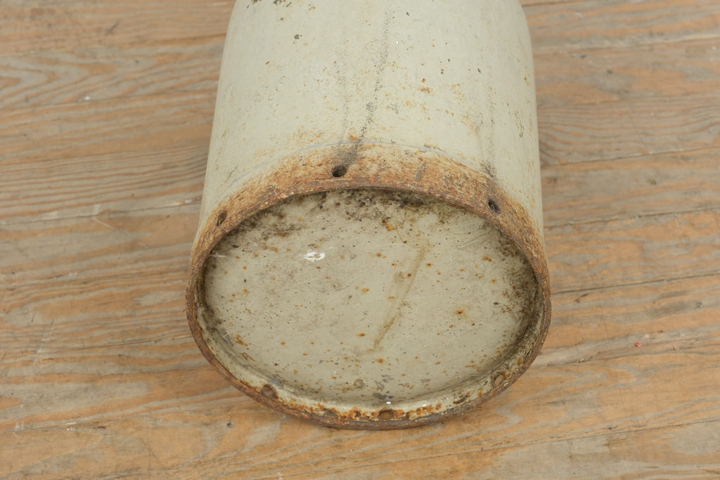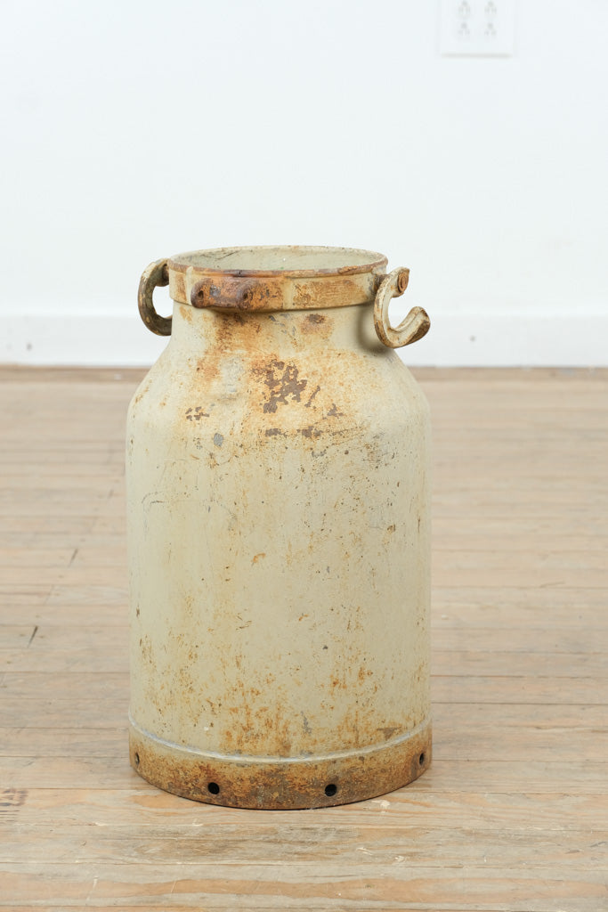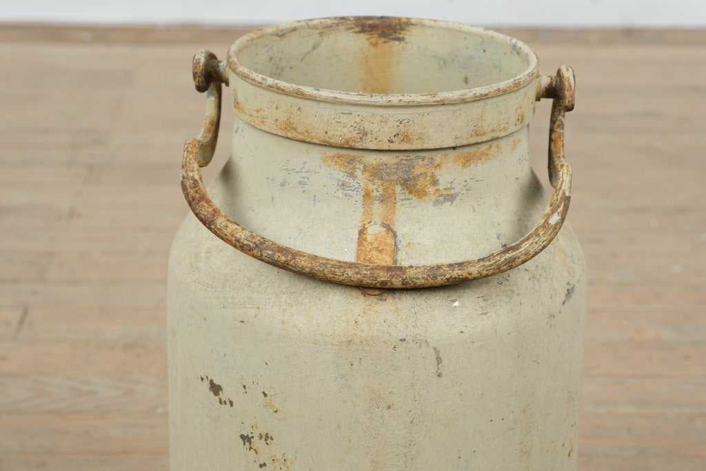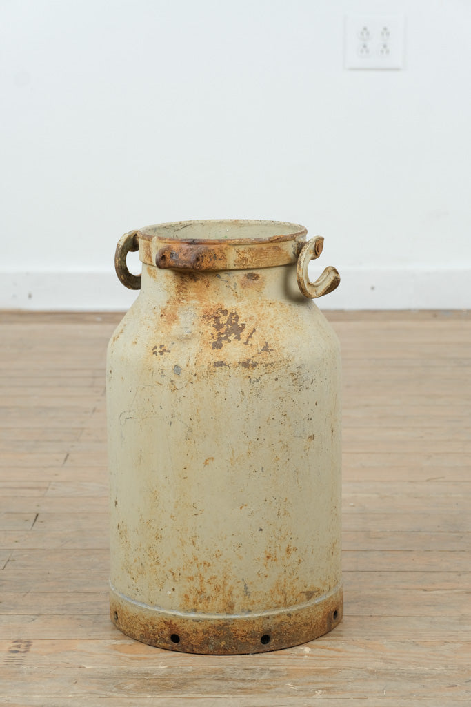 This authentic vintage galvanized milk can carries decades of honest wear and timeless agricultural character. Crafted from heavy-gauge metal with original side handles and a softly weathered cream patina, it embodies classic farmhouse utility and rustic charm. Standing approximately 18 inches tall and 10 inches round, this piece makes a striking decorative accent—perfect for dried florals, umbrella storage, or as a standalone statement in a farmhouse, industrial, or country-inspired space. The aged surface, rust accents, and utilitarian form speak to its history and enduring craftsmanship.