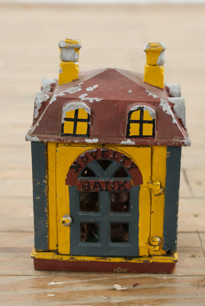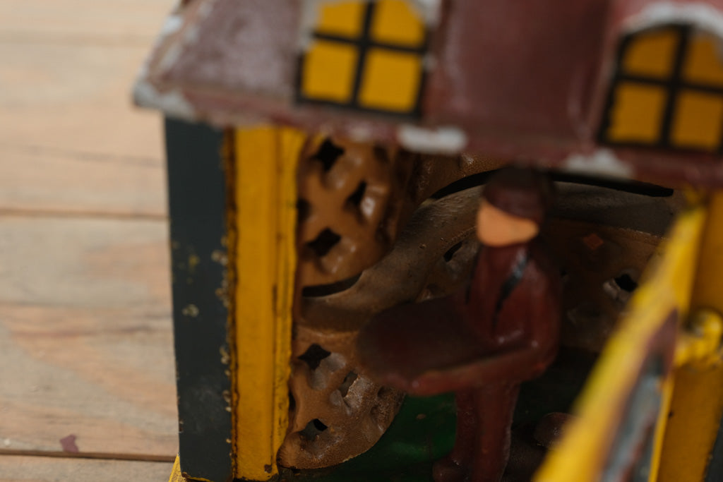 The bank operates by opening the front door, which causes a small interior figure holding a tray to swing outward. A coin is placed on the tray, and when the door is closed, the coin is deposited neatly into the internal storage area. The mechanism functions smoothly, offering both entertainment and historical appeal.