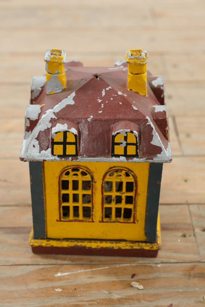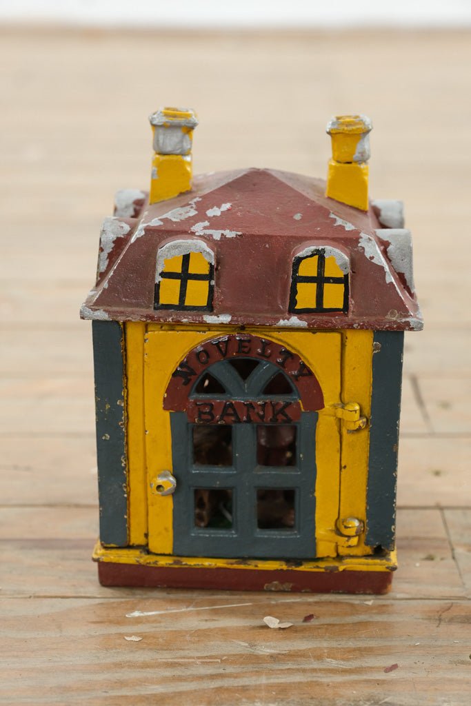Constructed of solid cast iron with hand-painted details, the bank features a colorful house façade, windows, chimneys, and a working front door. Measuring approximately 5 inches square by 6.5 inches tall, it has excellent shelf presence while remaining compact and display-friendly. This example is clearly a reproduction, ideal for collectors who want the classic design without the cost of an original antique.