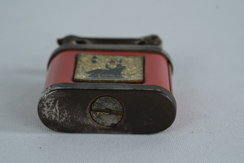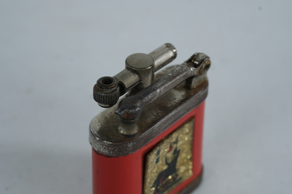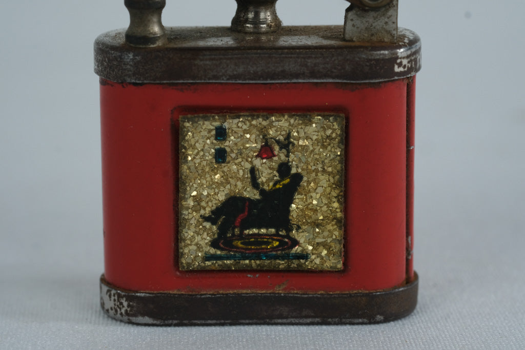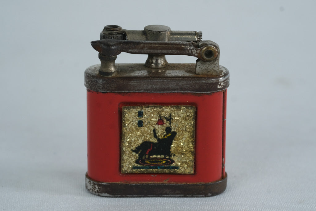 This vintage Girey lift-arm pocket lighter features a red enamel body accented with a decorative inset panel depicting a seated figure beneath an overhead lamp—an evocative mid-century graphic rendered against a gold-tone textured background. The lighter’s compact square form and classic lift-arm mechanism make it a desirable piece for collectors of early petrol lighters and smoking accessories.