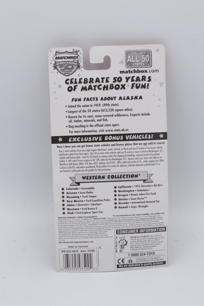 Celebrate the Last Frontier with this Matchbox Across America 50th Birthday Series collectible from 2002! The die-cast Snow Tracker captures Alaska’s rugged, frozen landscape with bold “Alaska Snow Tracker” graphics and an icy red-and-white color scheme. The matching “AK 049” decorative license plate marks Alaska as the 49th state in the Union.