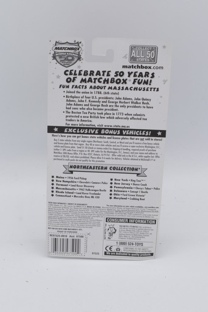 Celebrate The Spirit of America with this Matchbox Across America 50th Birthday Series collectible from 2002! This die-cast 1962 Volkswagen Beetle pays tribute to Massachusetts with its light blue finish and patriotic graphics featuring the state’s emblem and “Spirit of America” theme. The included “MA 006” decorative license plate marks Massachusetts as the 6th state in the Union.