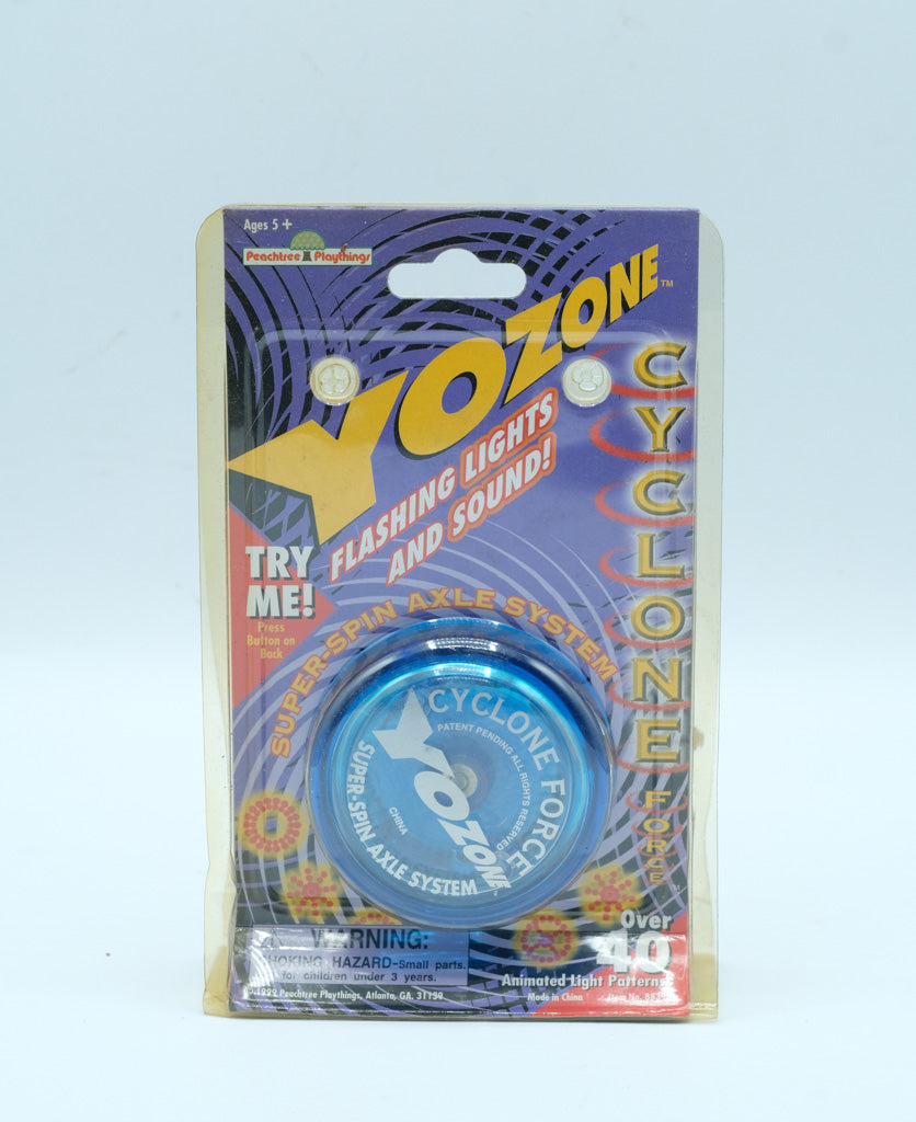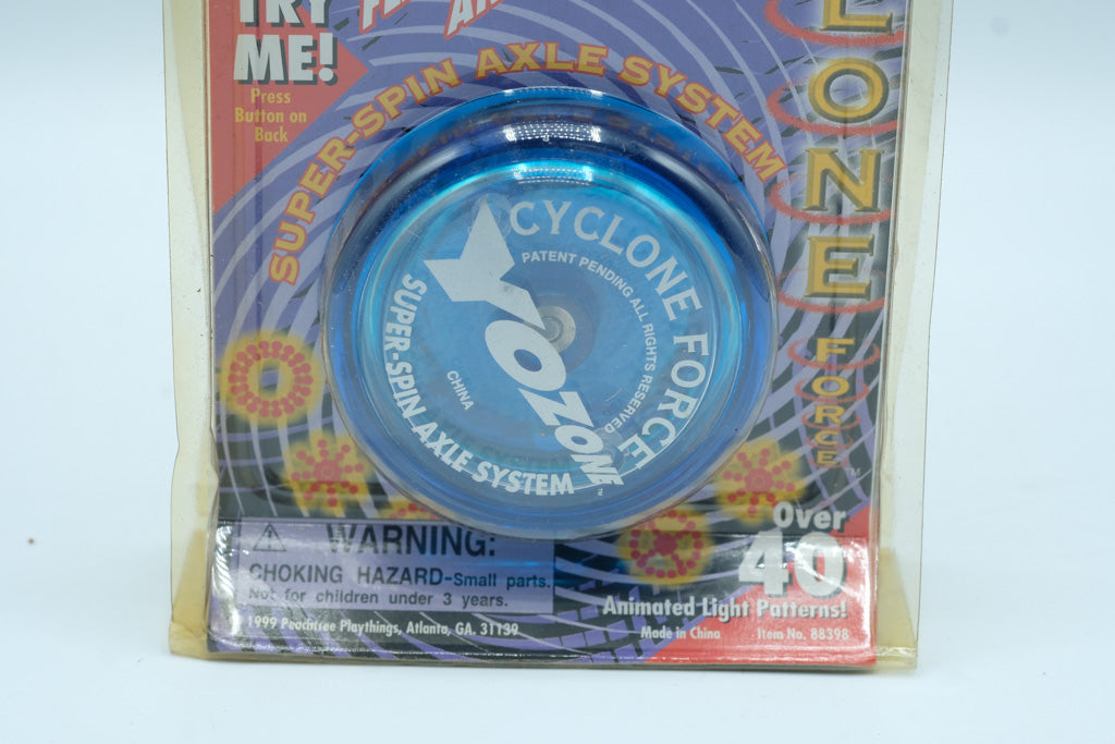 Blast back to the late 1990s yo-yo craze with this Yo-Zone Cyclone Force yo-yo, featuring flashing lights, sound effects, and a super spin axle system designed for high-speed tricks. This example remains unopened in its original blister packaging, making it an excellent collectible from the peak of the modern yo-yo revival era.