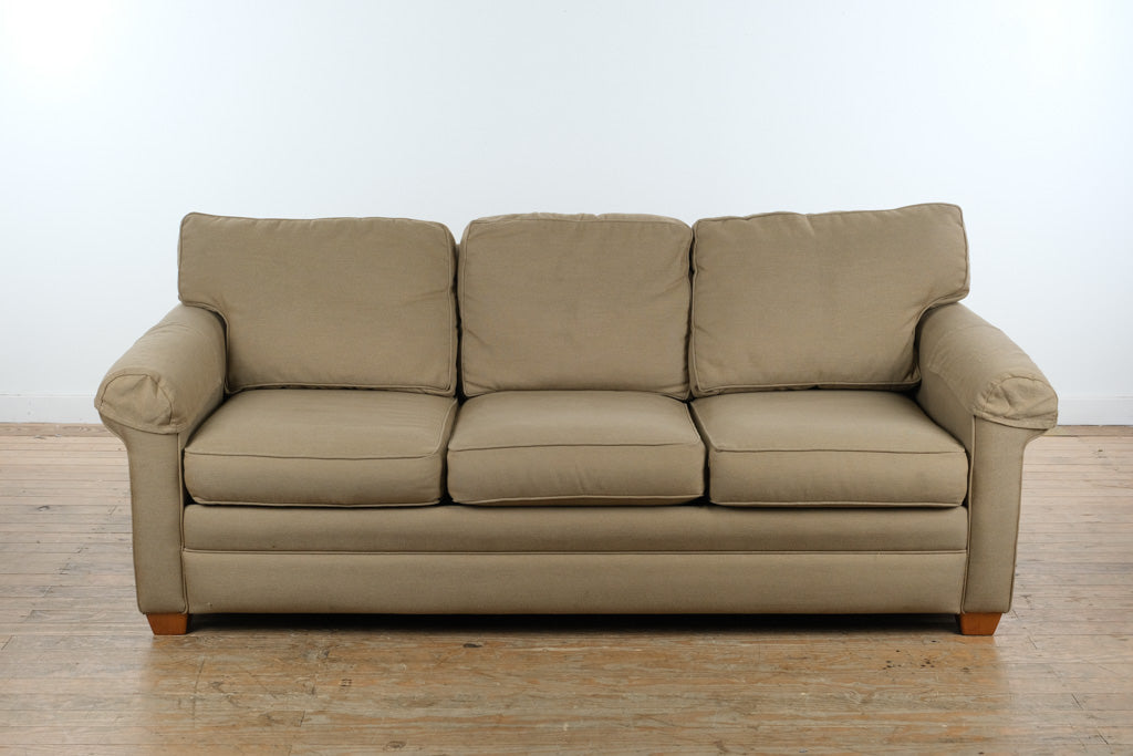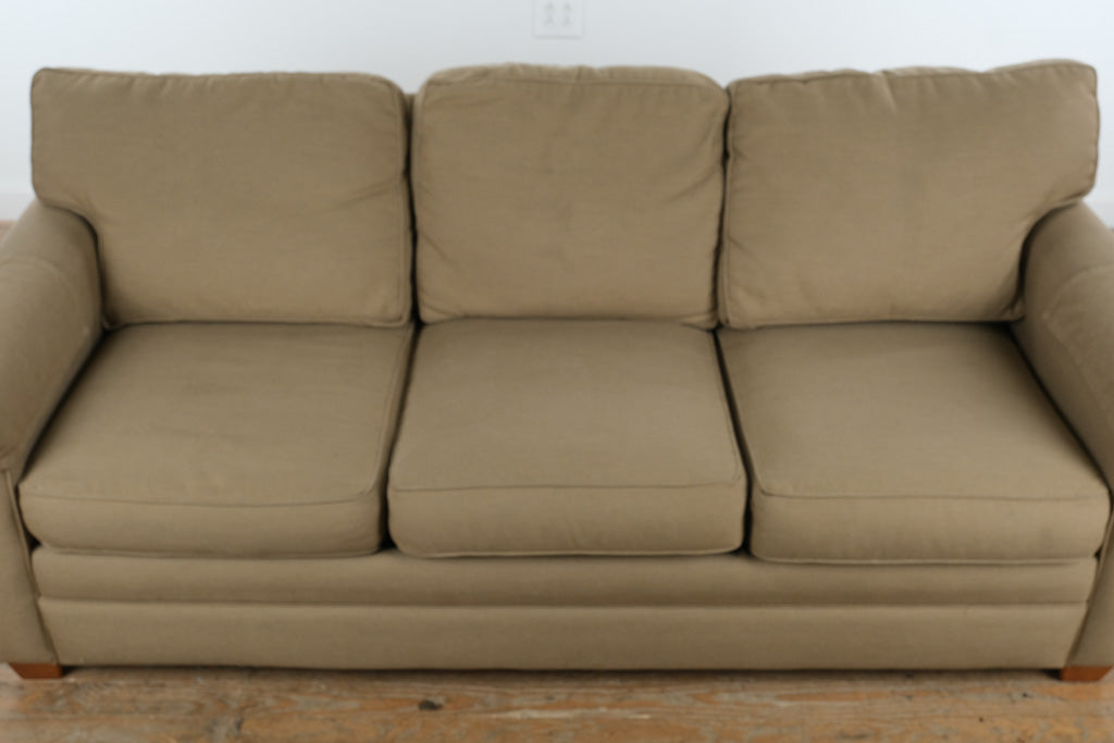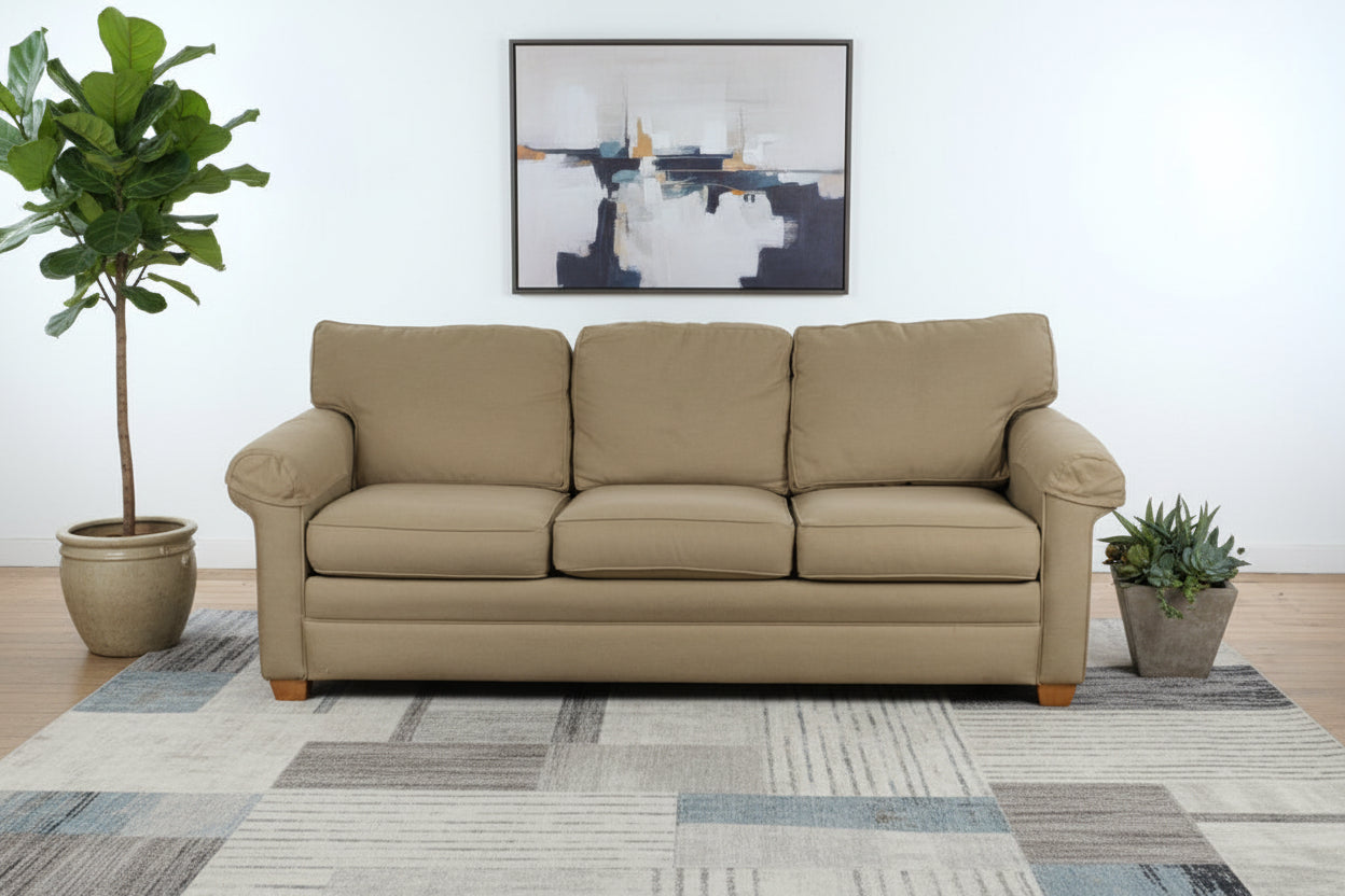 Beige upholstered sleeper sofa with rolled arms and pull out bed in a traditional transitional style. Neutral woven fabric and three over three cushion configuration provide balanced proportions suited for basement, guest room, or family room placement. Concealed fold out mattress system converts from full size sofa to guest bed, offering dual function seating and sleeping versatility available through Craze Furniture. Clean lines, tailored skirt base, and structured arm profile reflect durable residential construction designed for everyday use.