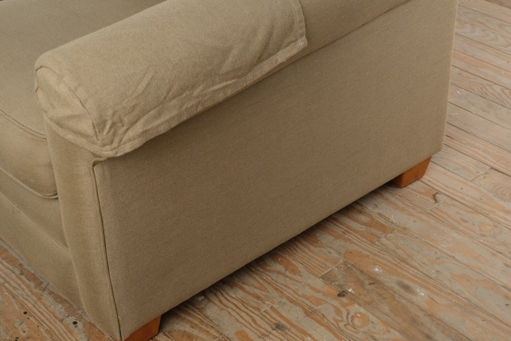 Woven neutral tone upholstery with welted seams.