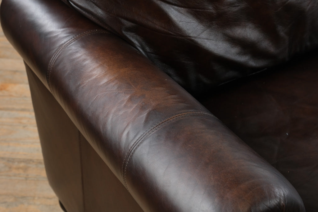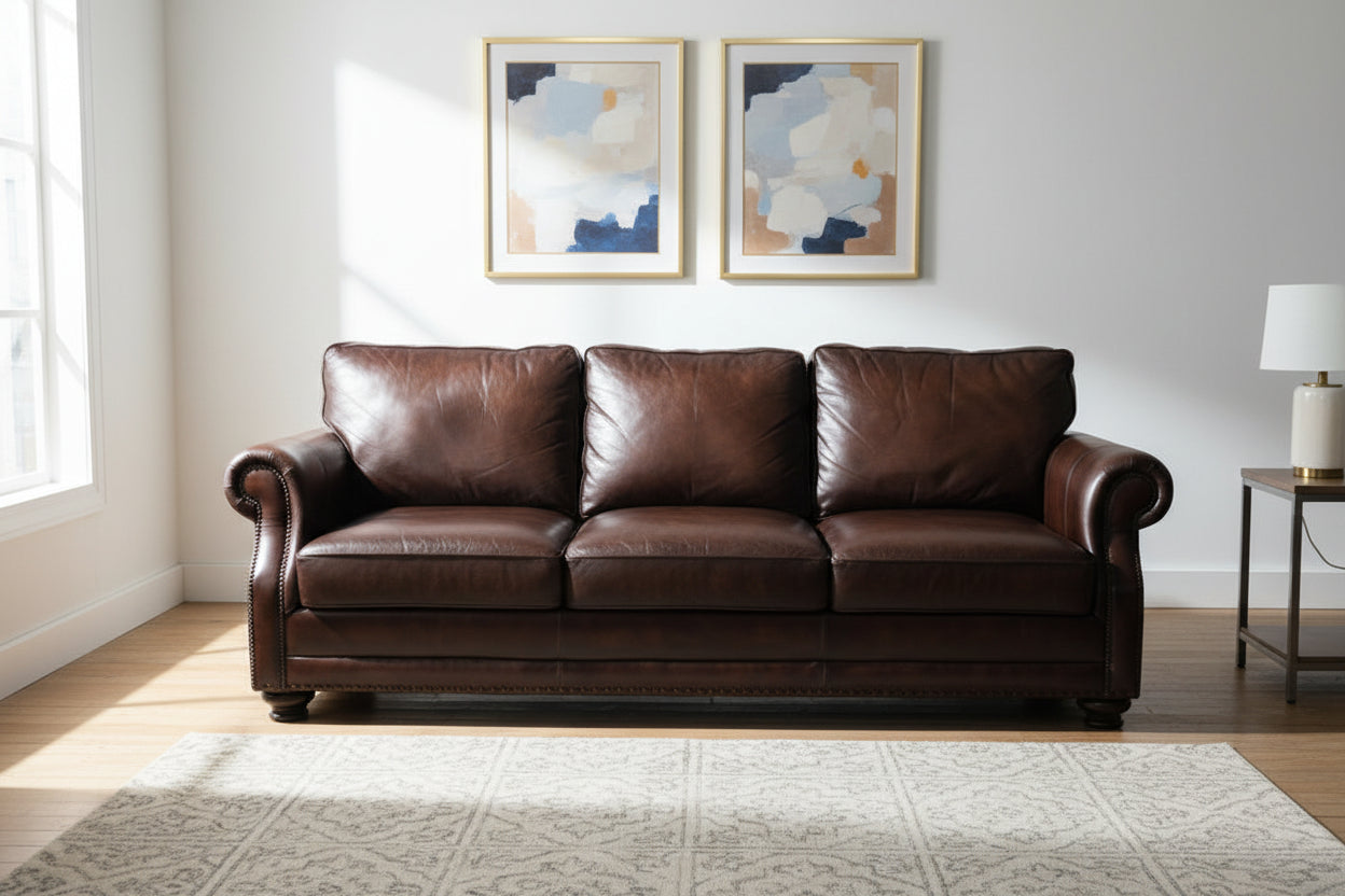 Classic rolled arm silhouette offers deep, comfortable seating suited for living rooms and offices. Natural leather wear adds character and aligns with vintage-inspired interiors.