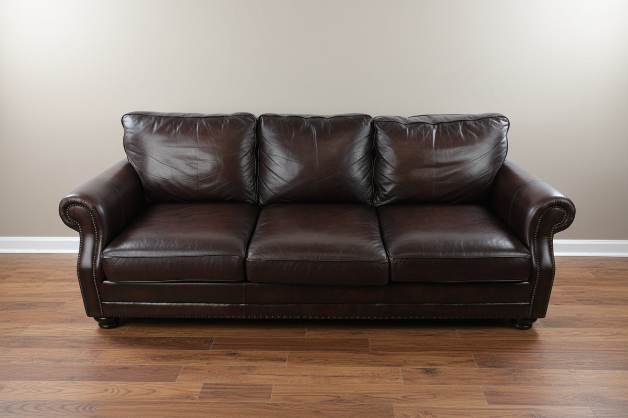 Brown leather sofa by Bernhardt featuring a three cushion seat, rolled arms, and nailhead trim detailing. Full leather upholstery with visible patina reflects natural wear patterns associated with high quality hides and long-term use. Craze Furniture presents this piece as a traditional lounge sofa with deep seating, supportive cushioning, and classic club-style proportions.