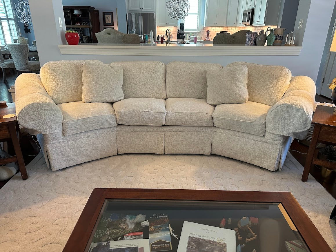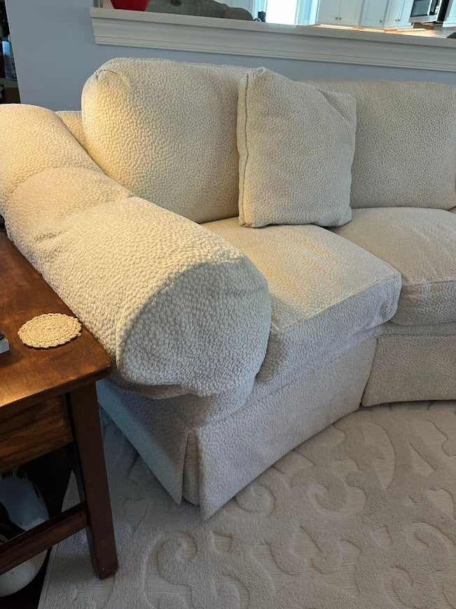 Curved sectional sofa in textured bouclé upholstery with contemporary lounge profile and deep seating proportions. Sculptural arc form maximizes conversation layout while maintaining a compact footprint for large living rooms. Multi-seat configuration with tailored skirt base and oversized rolled arms reflects late 20th century custom upholstery work. Presented by Craze Furniture as a high-end, custom-built piece prioritizing comfort, scale, and architectural presence.