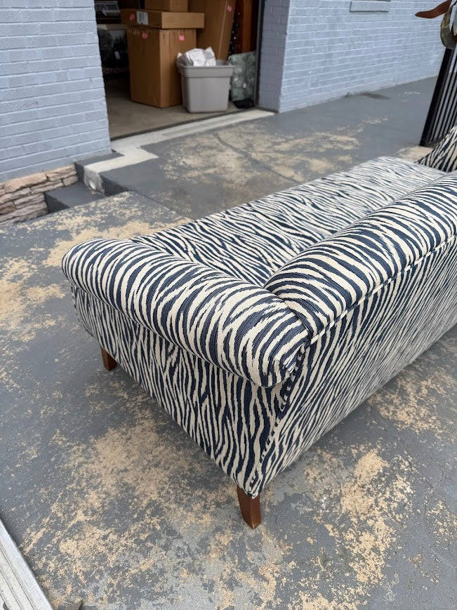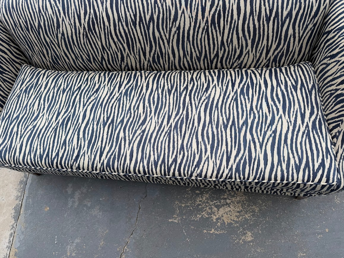 Expertly upholstered in a high-quality woven textile with a dynamic, zebra-inspired abstract pattern, this sofa showcases careful tailoring, generous cushioning, and a solid, well-balanced frame. The gently rolled arms and neatly finished seams reflect thoughtful craftsmanship, while tapered wood legs add a warm, grounding contrast.