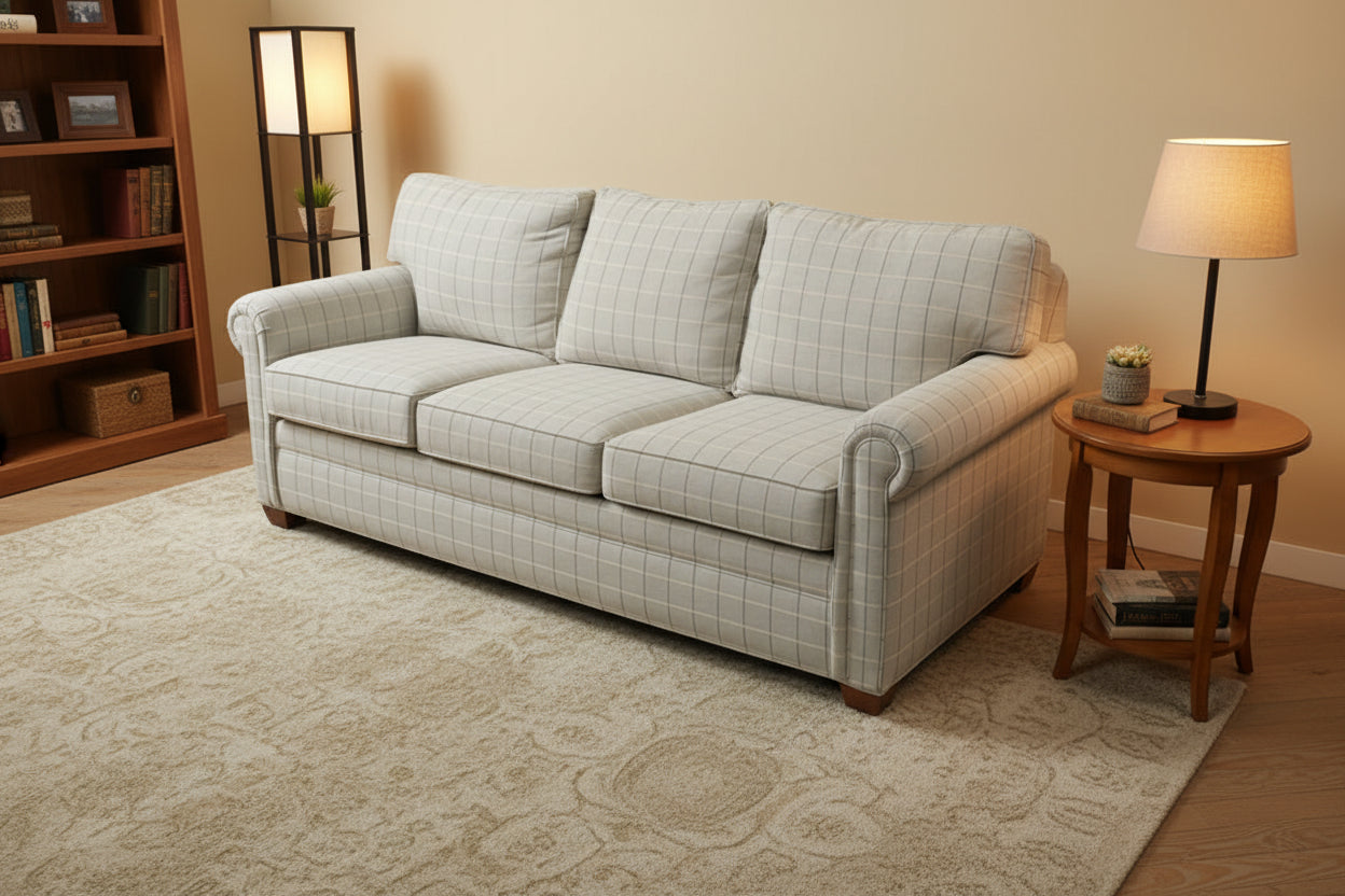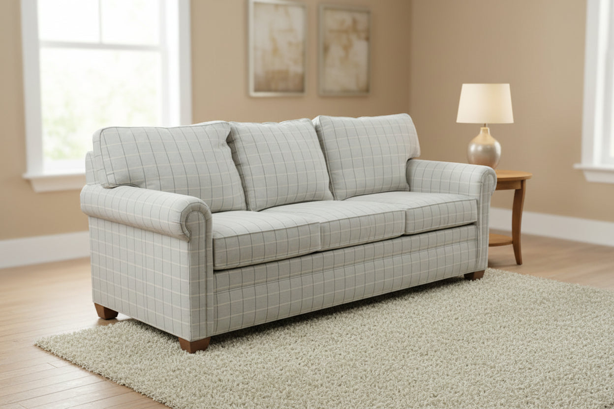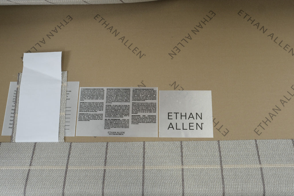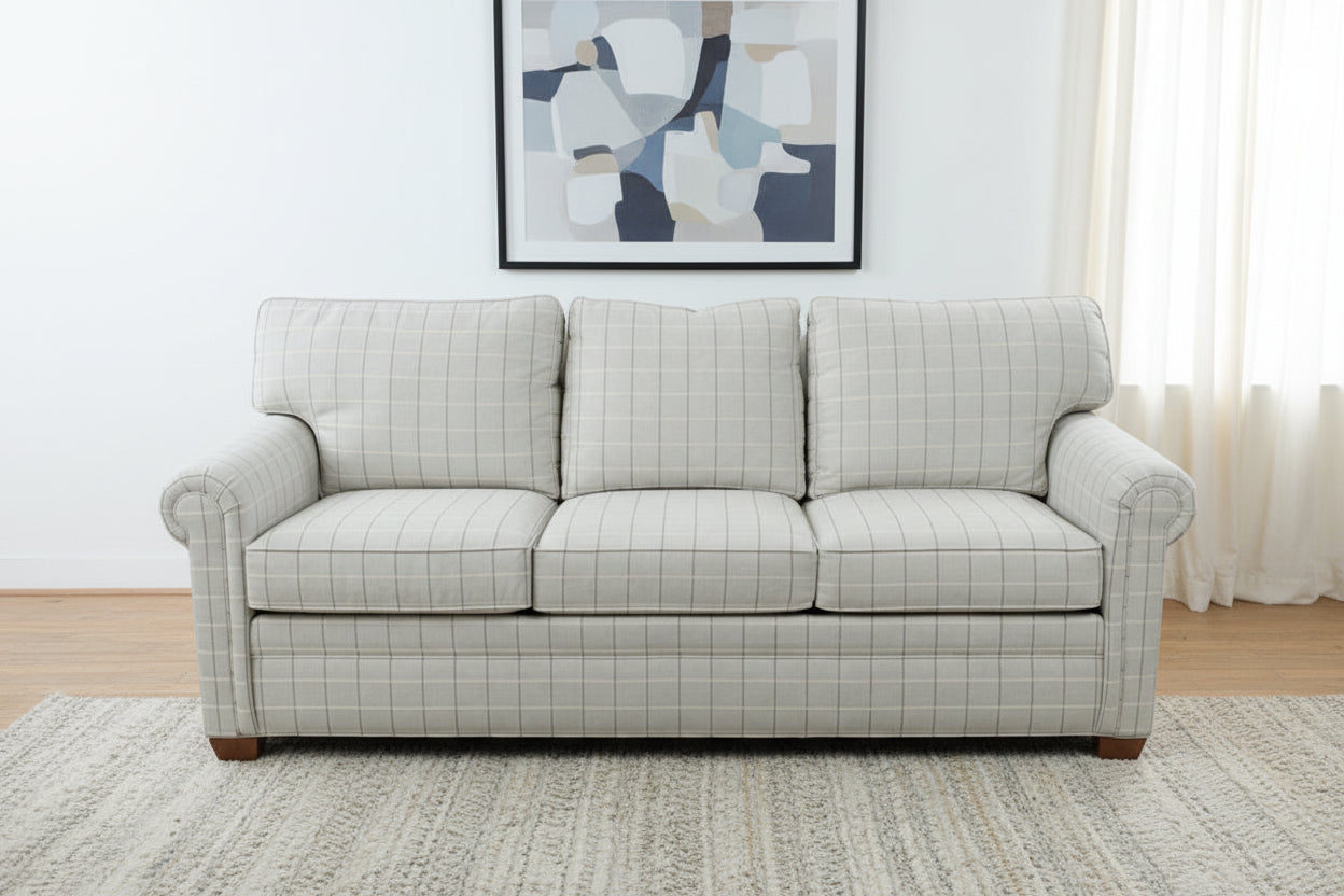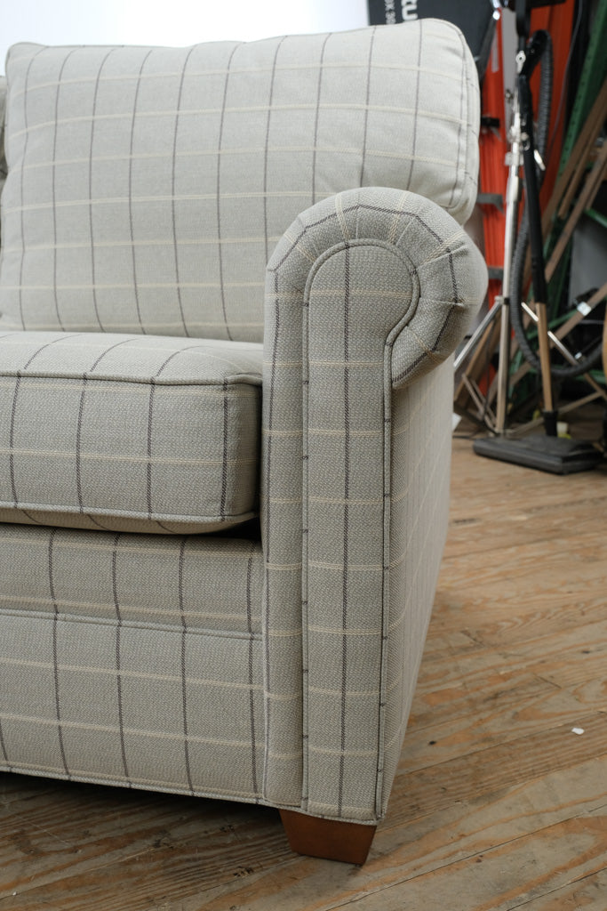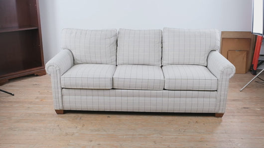 Upholstered three seat sofa in neutral plaid fabric with British style rolled panel arms and structured cushioned back. Conor model by Ethan Allen reflects updated classic design with tailored proportions and versatile scale suited to both traditional and transitional interiors, available through Craze Furniture. Tapered wood feet and grid pattern upholstery reinforce a clean architectural profile while maintaining everyday usability.