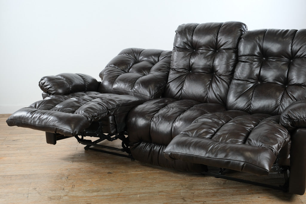 A substantial leather recliner sofa with clean utility and broad buyer appeal.