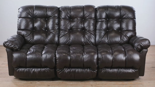 Dark brown leather reclining sofa in an oversized transitional silhouette with triple seat construction and manual outbound recliners. Produced by Best Chairs Co, this 88 inch sofa uses deep channel tufting, heavily padded arms, and a high split back profile associated with late twentieth century comfort driven American upholstery. Offered by Craze Furniture, the design prioritizes full lounge seating with independent end recliners and a center seat that remains upright for standard daily use.