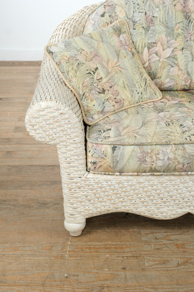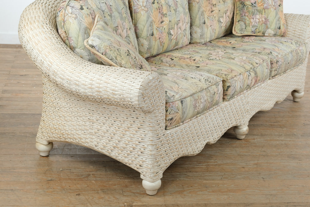 This beautiful off-white woven wicker sofa captures the relaxed charm of vintage coastal living with its soft curves, scalloped base, and fully woven frame. Designed to match the lounge chair, ottoman, and coffee table in the same collection, this sofa features the same tropical botanical tapestry cushions—lush greens, muted pinks, sandy neutrals, and subtle island florals.